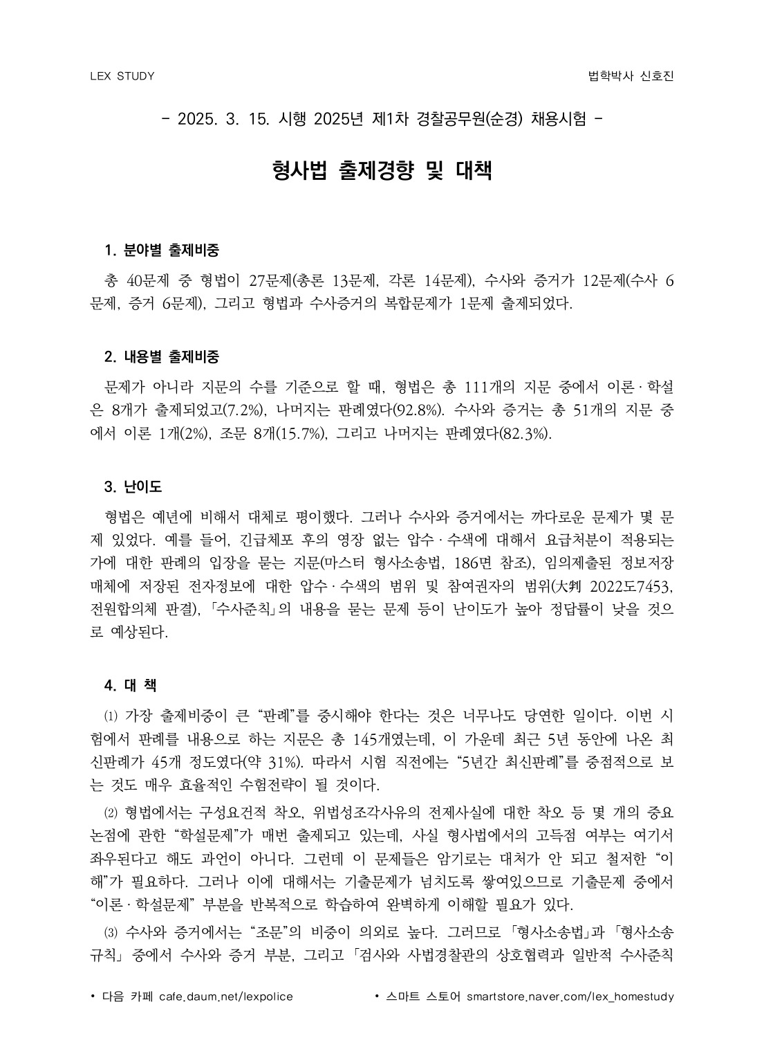25년 순경 1차 형사법 출제경향 및 대책 작성자도서출판 문형사 / LEX STUDY|작성시간25.03.17|조회수834 목록 댓글 0 글자크기 작게가 글자크기 크게가 다음검색 현재 게시글 추가 기능 열기 북마크 신고 센터로 신고 댓글 댓글 0 댓글쓰기 답글쓰기 댓글 리스트