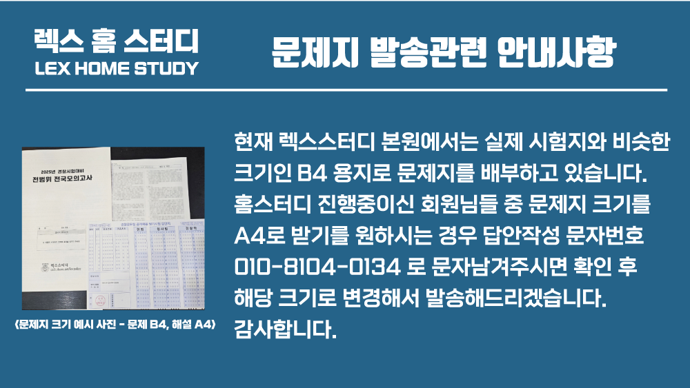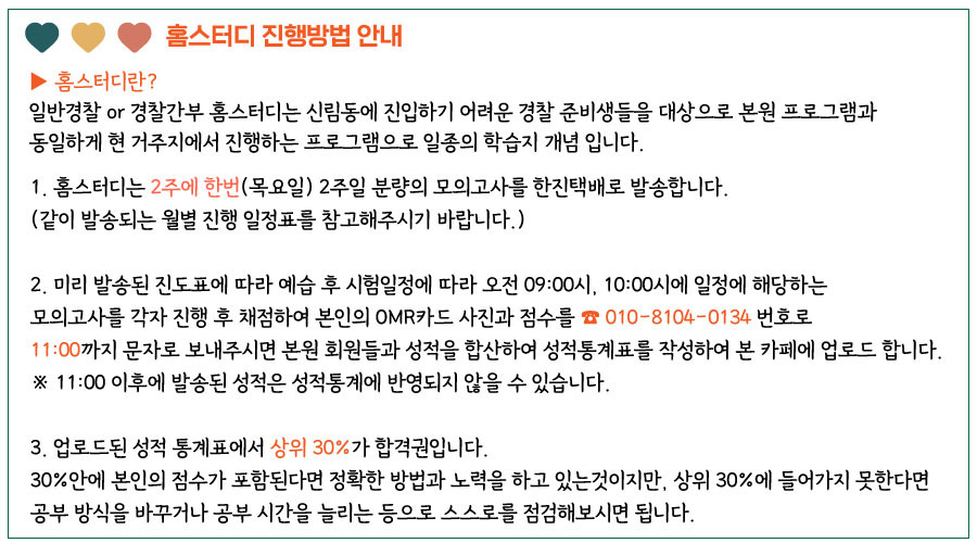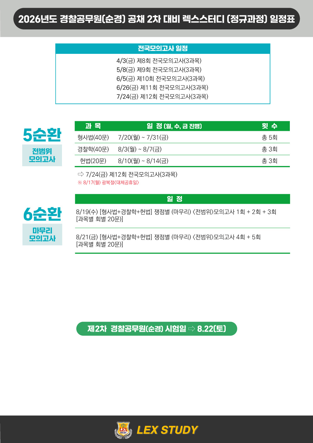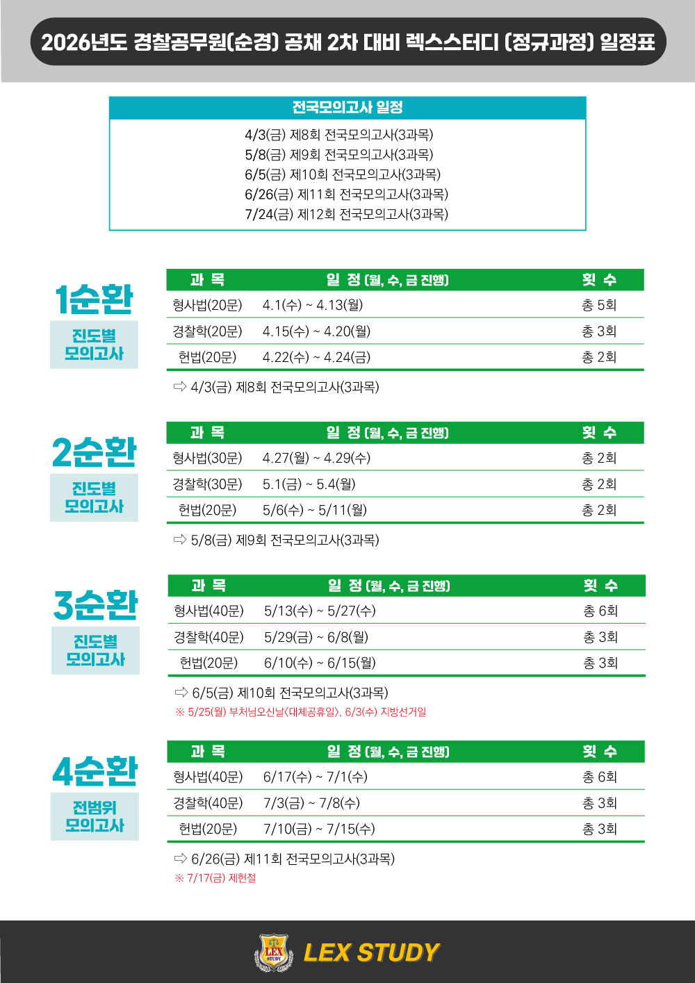 [일반경찰]26년 순경 공채 2차 대비 렉스 홈스터디 (1순환~시험전 과정, 4.1~8.21) 등록안내 작성자렉스 김과장|작성시간26.03.17|조회수380 목록 댓글 0 글자크기 작게가 글자크기 크게가 #스토어바로가기26년 순경 공채 2차 대비 렉스 홈스터디 1순환~시험전(4.1~8.21) 과정 : 렉스 스터디26년 순경 공채 2차 대비 렉스 홈스터디 1순환~시험전(4.1~8.21) 과정 : 렉스 스터디[렉스 스터디] 경찰 승진,간부,채용 | 법원 | 검찰 - 신호진 박사의 렉스스터디 입니다.smartstore.naver.com# 순경 공채 2차 대비 일정표 다음검색 현재 게시글 추가 기능 열기 북마크 공유하기 신고 센터로 신고 댓글 댓글 0 댓글쓰기 답글쓰기 댓글 리스트