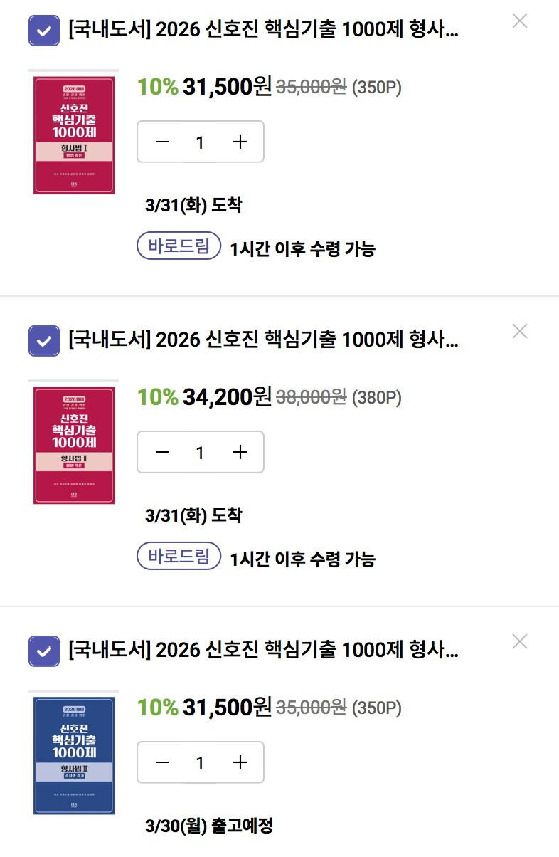 기출문제집 문의 작성자표순경|작성시간26.03.29|조회수123 목록 댓글 4 글자크기 작게가 글자크기 크게가 안녕하세요! 순경 2차대비를 위해 기출 문제집을 구매하려고 하는데요이렇게 3개의 책을 구매하여 공부하면 되는 것 인지 궁금하여 글을 올립니다. 다음검색 현재 게시글 추가 기능 열기 북마크 공유하기 신고 센터로 신고 댓글 댓글 4 댓글쓰기 답글쓰기 댓글 리스트 해당 댓글은 작성자와 운영진만 볼 수 있습니다. 작성자제발합격! | 작성시간 26.03.30 답변 궁금합니다..!ㅠㅠ 답댓글 작성자표순경 작성자 본인 여부 작성자 | 작성시간 26.03.30 올린 교재가 맞고 다른 궁금한 내용은 학원으로 문의하라고 하십니다. 답댓글 작성자제발합격! | 작성시간 26.03.30 표순경 알려주셔서 감사합니다..! 댓글 전체보기