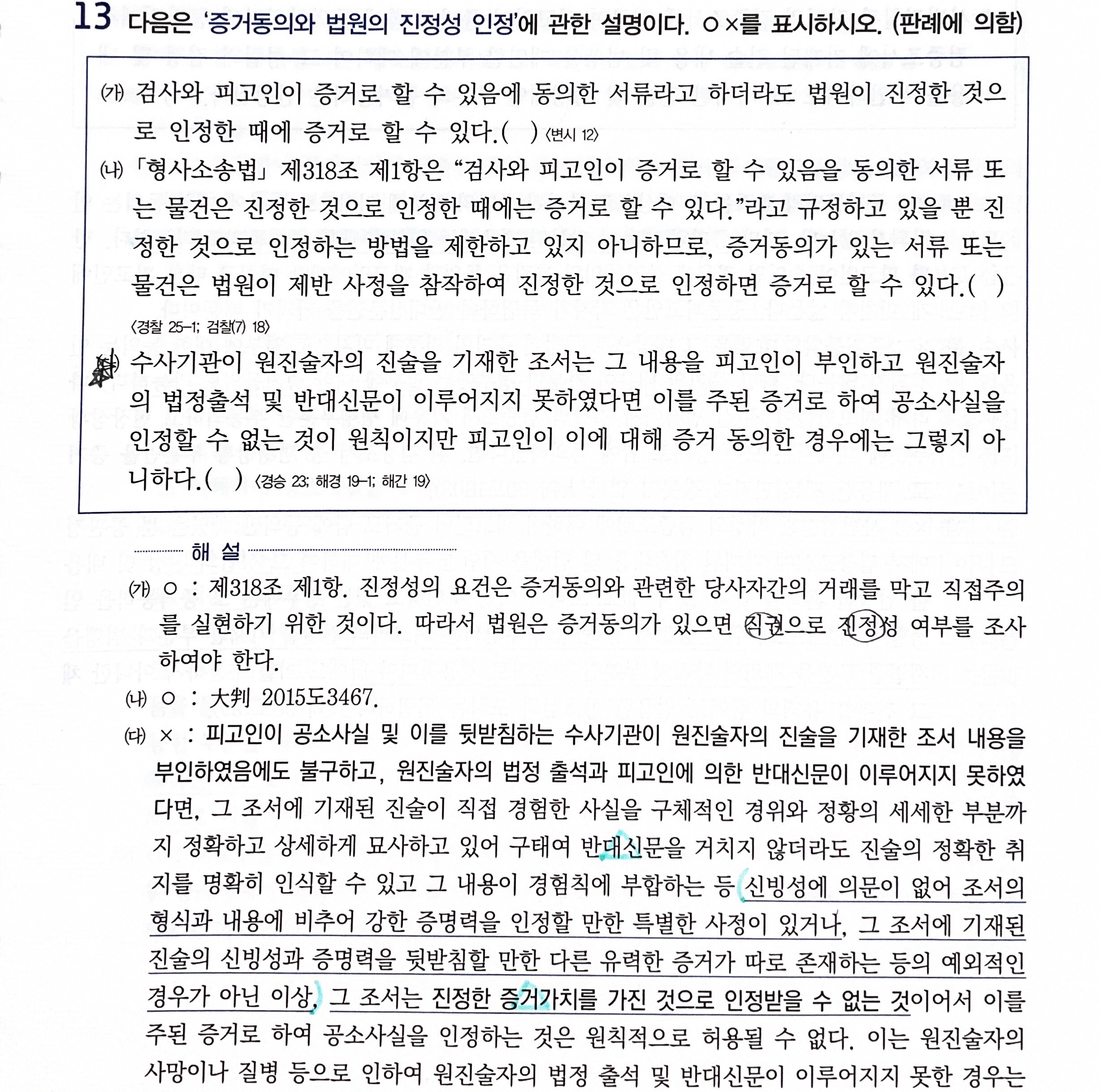 이 지문은 피고인의 증거동의로 증거능력은 인정되나, 증명력이 부족하기 때문으로 이해했는데 (타 이론서에는 이렇게 정리됨)