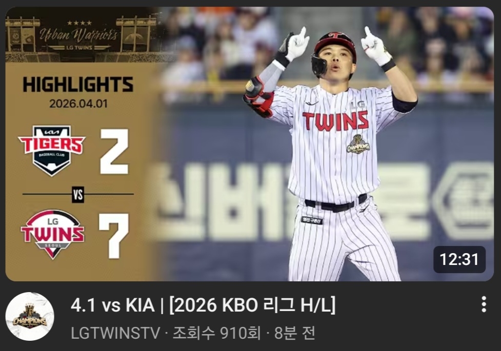 2026년 프로야구 4월1일 수요일 KIA : LG(잠실) 작성자수전사|작성시간26.04.02|조회수18 목록 댓글 1 글자크기 작게가 글자크기 크게가 https://youtu.be/DpTX4zCF53E?si=bv4N6iqDNHTSA3sW 다음검색 현재 게시글 추가 기능 열기 북마크 공유하기 신고 센터로 신고 댓글 댓글 1 댓글쓰기 답글쓰기 댓글 리스트 작성자『카페지기_정희철』 | 작성시간 26.04.02 올해도 잘부탁드립니다 감사합니다~^^ 댓글 전체보기