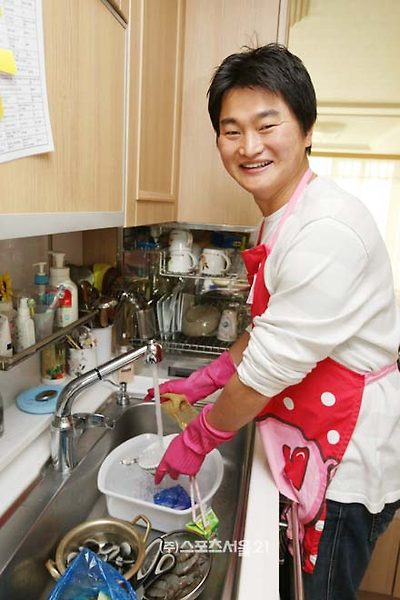 "이건 연출사진이에요." 가끔씩 설겆이를 하는 박명환이 싱크대 앞에서 앞치마를 두른 채 설겆이를 하고 있다. 사실 고무장갑은 애용(?)하지만 앞치마는 잘 두르지 않는다는 그는 "어울리나요?"라고 한마디.