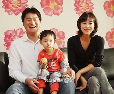 LG 박명환(왼쪽)과 부인 이호주씨(오른쪽)가 사랑하는 딸 승리양을 가운데 두고 환한 웃음을 짓고 있다. '이 보다 더 좋을 순 없다'는 듯 행복에 가득 찬 표정이다.