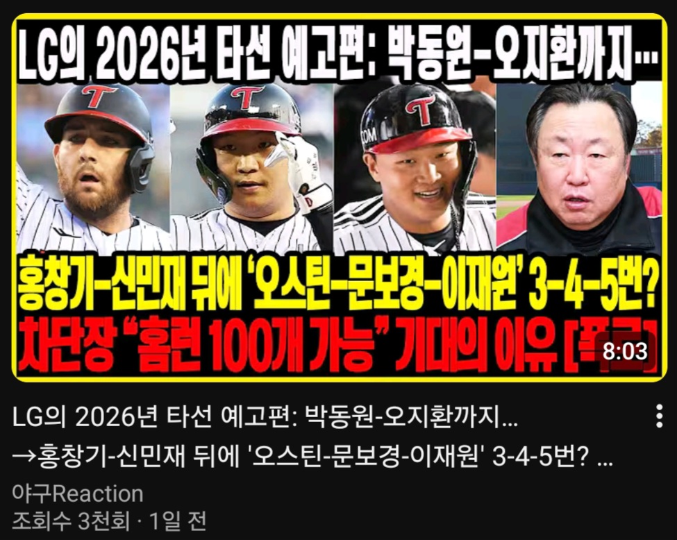 LG의 2026년 타선 예고편 작성자수전사|작성시간25.12.21|조회수14 목록 댓글 0 글자크기 작게가 글자크기 크게가 https://youtu.be/ElTyfnWGMo4?si=OT7dQq-zx92oj-Lz 다음검색 현재 게시글 추가 기능 열기 북마크 공유하기 신고 센터로 신고 댓글 댓글 0 댓글쓰기 답글쓰기 댓글 리스트
