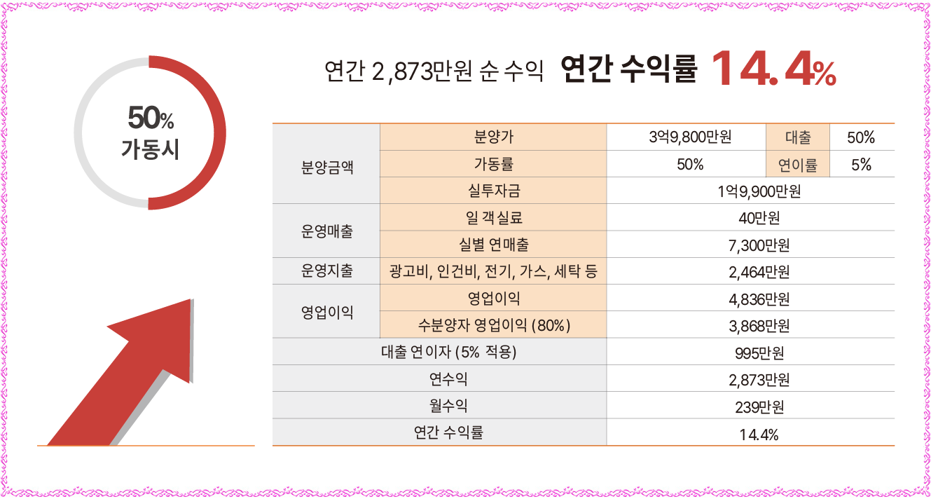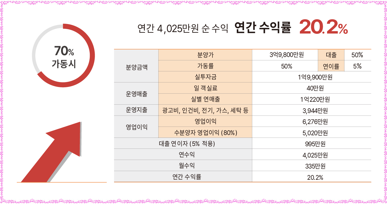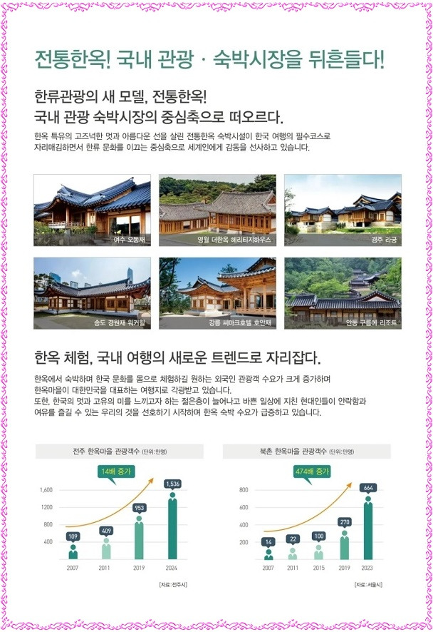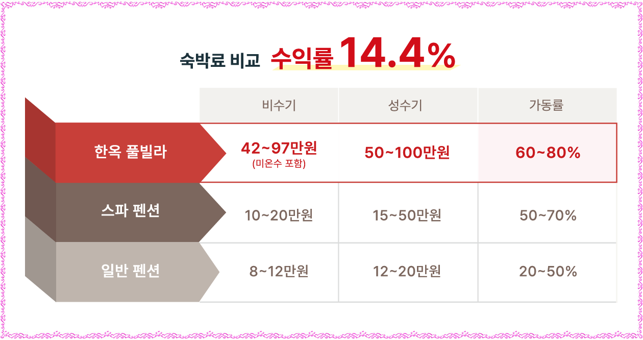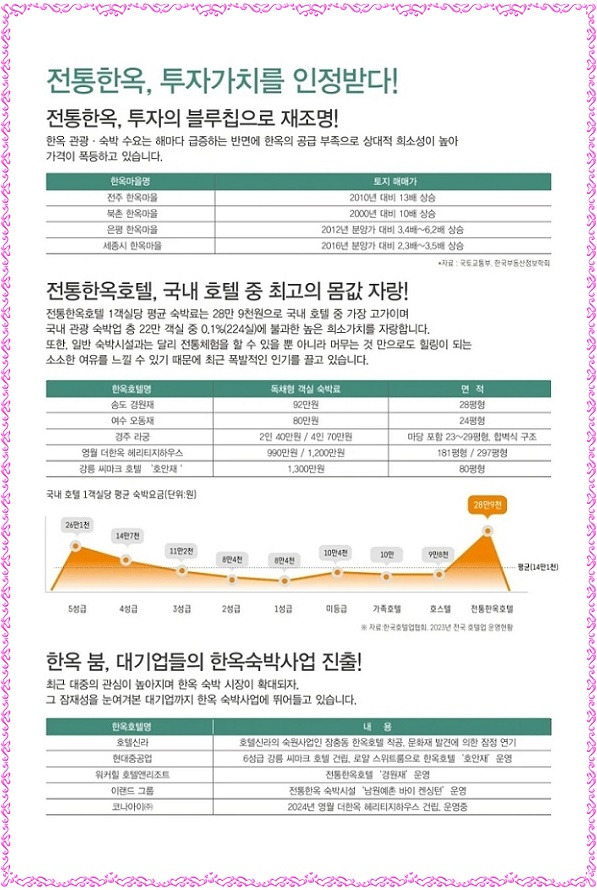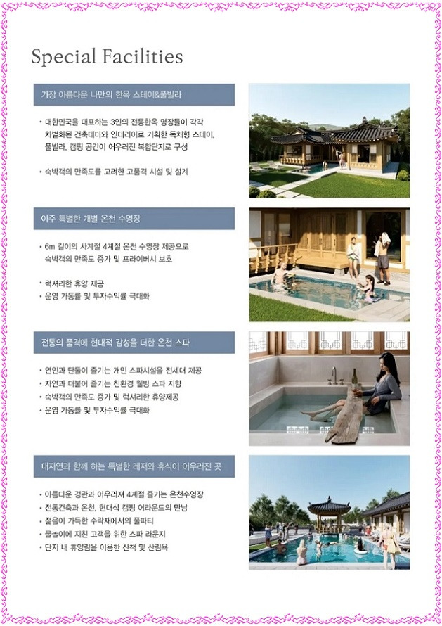 그리고, MZ세대 감성 여행∘외국인 K-컬처 체험 열풍으로 수익형 부동산의 중심은 전통 한옥(한옥 숙소 절대 부족 상황➡국내 23,957개의 펜션 중 한옥 풀빌라는 20개소(0.1%) 미만으로 높은 희소성)으로 투자가치를 인정받으며 최고의 몸값을 자랑하고 있으며 1가구 2주택 無, 토지∘건축물 등기 소유 가능, 최대 50% 융자, 전통 한옥 중 실투자금 1억원 대 국내 최저 분양가로 연수익률 20% 안팎의 안정적인 고수익 창출이 가능하며 운영 전문 기업을 통해 숙박시설 관리, 연간 12회 무료 숙박 이용 혜택, 연간 18회 회원가 이용 혜택을 제공할 예정입니다.
