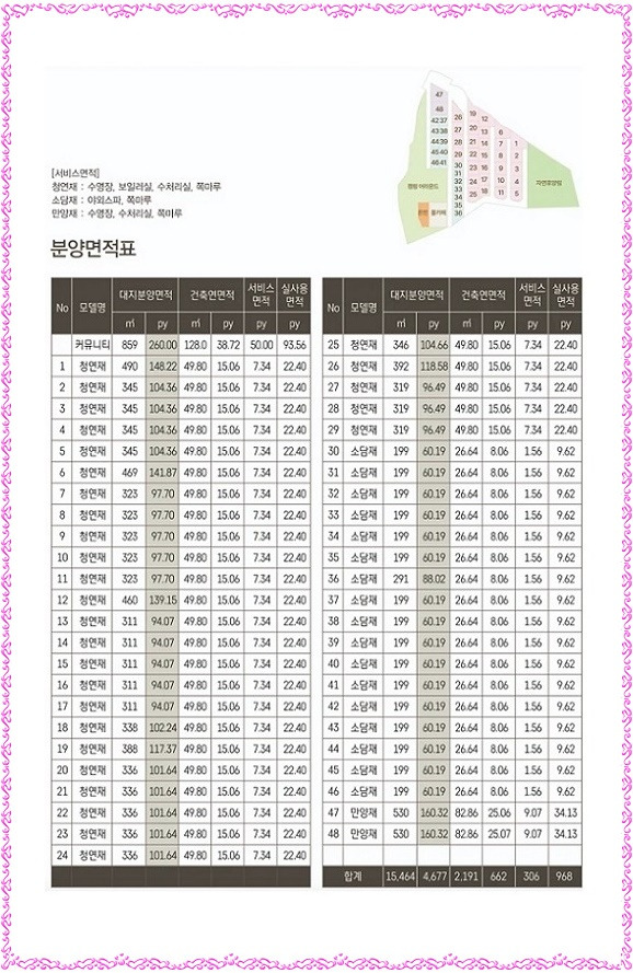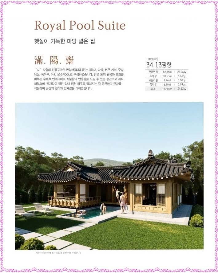 전용면적 82.86㎡(25.06py)∘수영장 18.60㎡(5.63py)∘보일러실 4.96㎡(1.50py)∘쪽마루 6.39㎡(1.94py)∘합계 112.81㎡(34.13py)