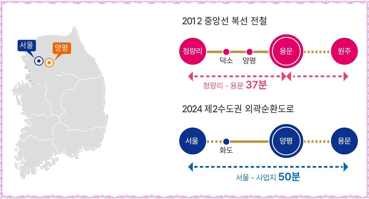 한스테이 양평은 경의중앙선 용문역∘지평역, 용문홍천간 광역철도(예정), 용문버스터미널, 341번 지방도, 서울양평고속도로(사업 재추진 중), 수도권제2순환도로 등 서울, 수도권 어디든 쾌속 이동 사통팔달 교통요충지입니다.