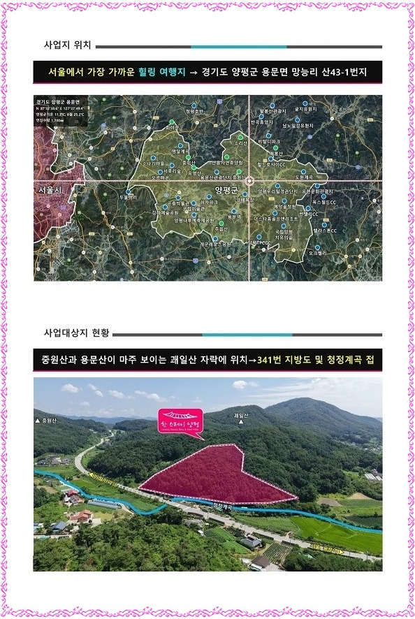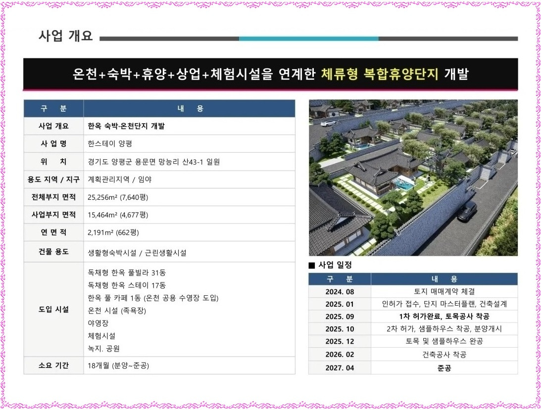 한스테이 양평은 한옥 숙박∘온천단지 개발 사업개요, 한스테이 양평 사업명으로 경기도 양평군 용문면 망능리 산43-1 일원 계획관리지역, 임야에 생활형숙박시설(독채형 한옥 풀빌라 31동∘독채형 한옥 스테이 17동∘한옥 풀 카페 1동(온천 공용 수영장 도입), 근린생활시설로 구성(예정)됩니다.