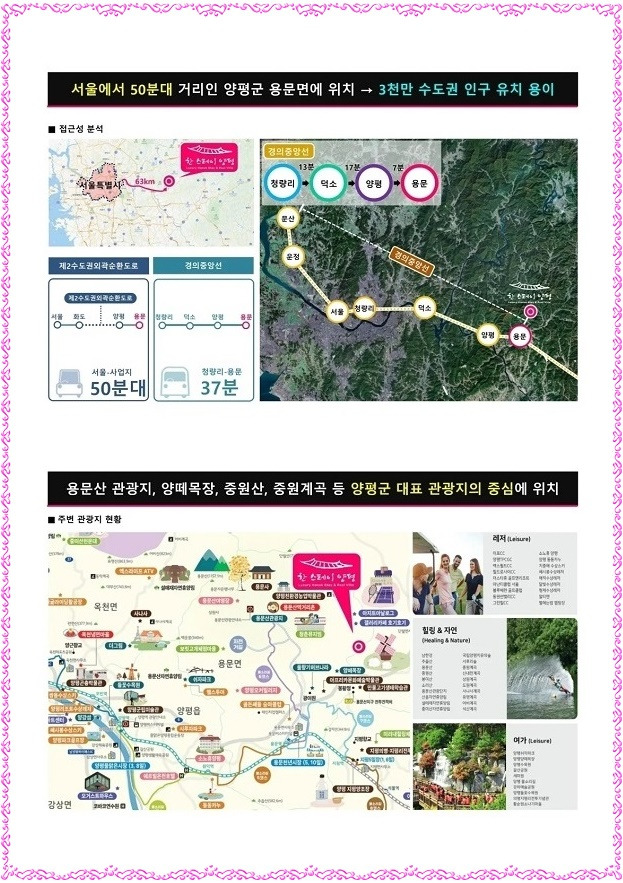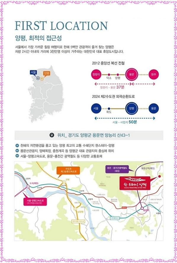 한스테이 양평은 국내 첫 온천과 한옥 풀빌라를 결합한 복합단지로 서울에서 1시간 거리에 위치하고 연 500만 명 이상이 찾는 수도권 대표 관광지인 양평의 중심 입지이며 용문산관광지∘양떼목장∘중원산∘중원 계곡∘비발디파크 등과 인접하여 관광수요 흡수 용이 등 직주근접 배후 수요를 품었습니다.