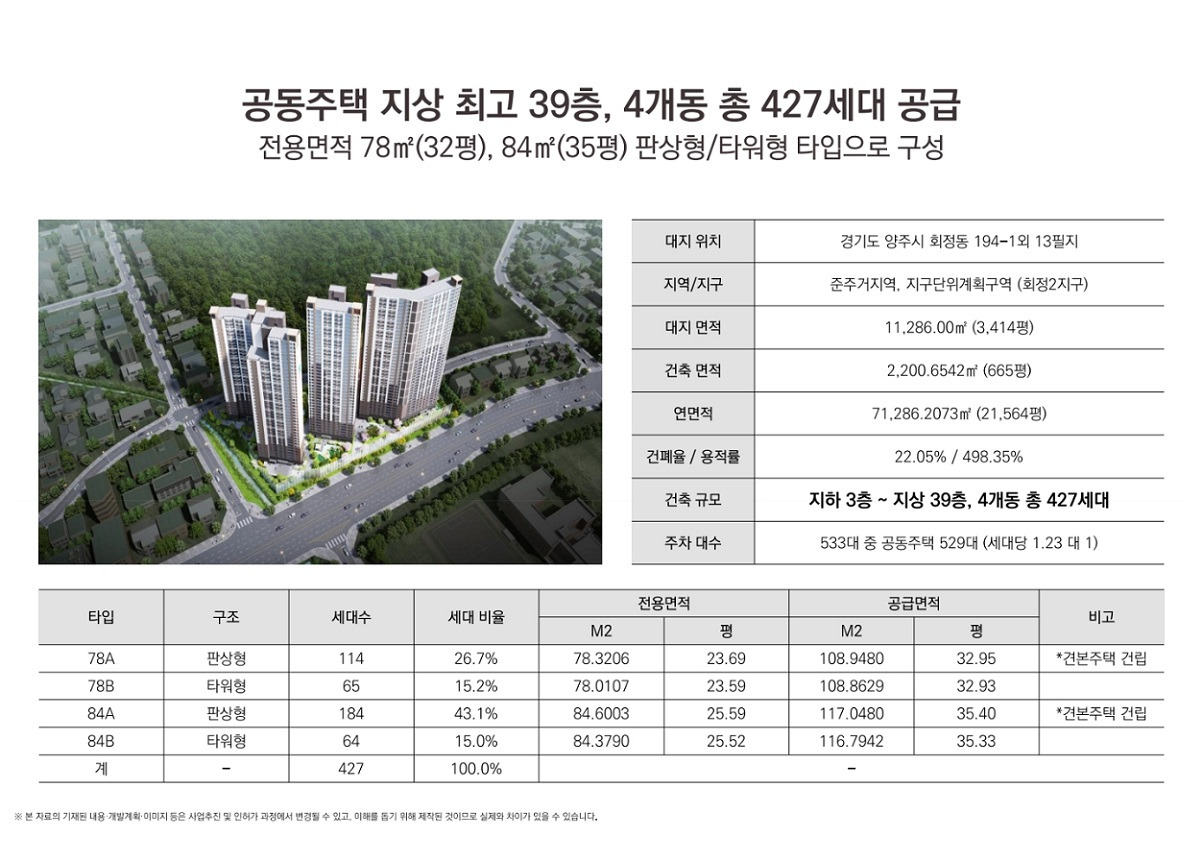 양주 덕정역 에피트는 경기도 양주시 회정동 194-1번지 준주거지역, 지구단위계획구역(회정2지구) 일원에 지하3층~지상최고39층 4개동 규모로 조성(예정)되며 공동주택(아파트) 427세대 및 부대복리시설로 구성(예정)됩니다.