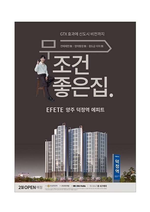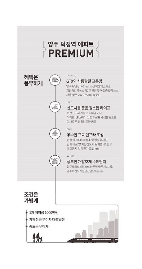 양주 덕정역 에피트는 사람과 사람을 이어주고 도시와 도시, 지역과 지역을 빠르게 연결하는 GTX⚪지하철⚪고속도로 동시다발 추진 수혜로 생활 반경이 넓어지고 유동 인구가 늘어나면서 지역은 활기가 넘치고 지역경제도 활성화되어 지역 부동산 가격상승 요인작용, 1차 계약금 1000만원, 계약잔금 무이자 대출알선, 중도금 무이자 등 최초부터 자금부담 없는 계약조건, 비교할수록 높은 가치, 따져볼수록 최고의 선택입니다.