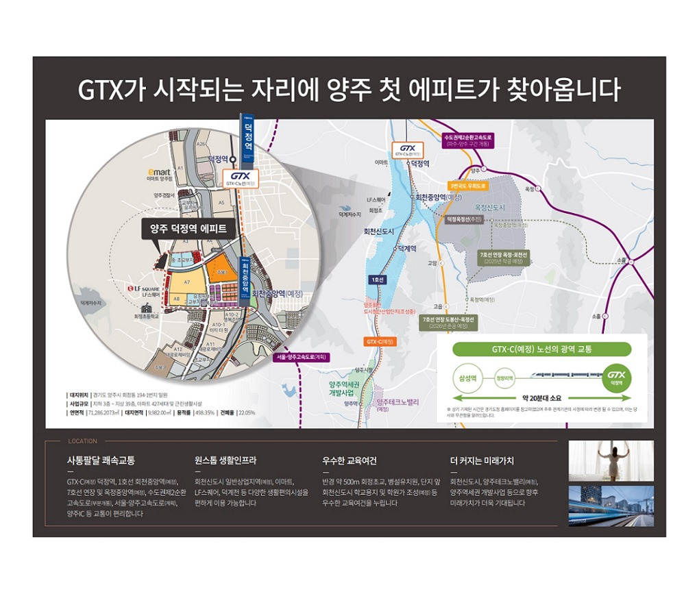GTX, 1호선으로 서울을 빠르게 잇고 회천신도시를 바로 잇는 경기북부 교통의 중심지, 자연까지 더 가깝게 숲세권의 자연청정, 양주 덕정의 미래를 품고 개발비전으로 넘쳐나는 도시, 양주가 바라던 모든 것, 양주 첫 한라비발디로 이어지는 양주 첫 에피트, 양주 덕정역 에피트를 분양합니다.