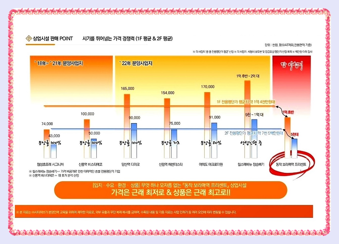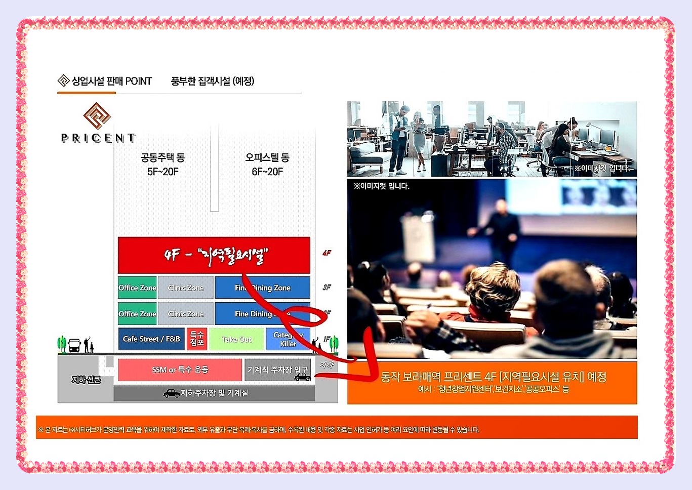 동작 보라매역 프리센트 상가는 교통, 수요 모든 것을 갖춘 상권, 흐르는 유동의 상권, 풍부한 배후수요의 상권, 타 상권을 압도하는 비교불가 보라매 상권, 높은 상업시설 노출도로 강제적인 시선강탈 관심도 흡수, 2F~3F 전면부 소형호실, 내부 대형호실 등 다양한 호실 모듈확보로 원활한 수요확보 등 특화설계를 하였습니다.