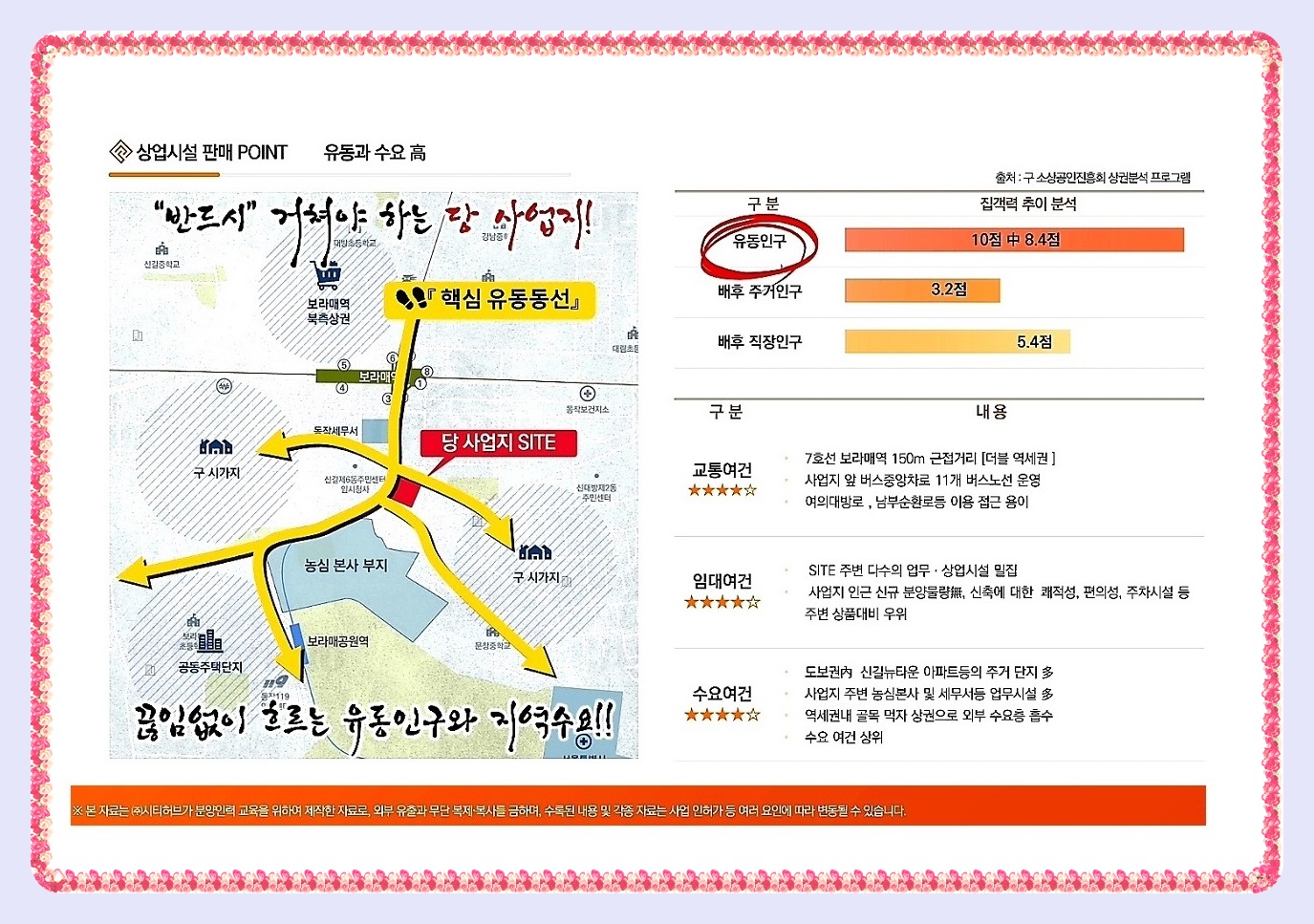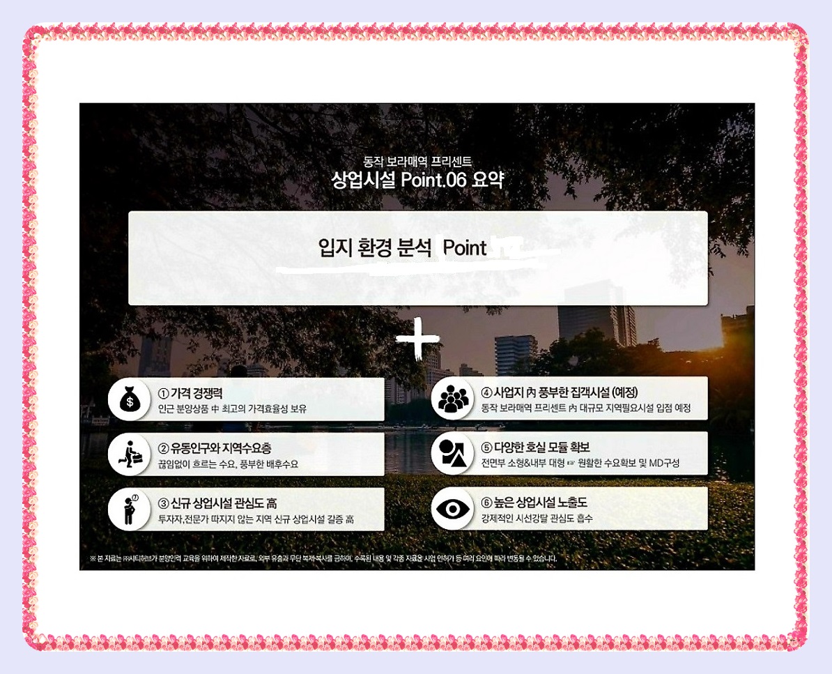 동작 보라매역 프리센트 상가는 일 평균 이용객수 평균 약 18만명(전 노선⚬환승포함), 7호선 신대방삼거리역~보라매역 사이 2만여 배후인구(배후세대 약 5천세대), SITE 주변 다수의 업무⚬상업시설 밀집, 농심그룹 사옥, SK텔레콤 보라매사옥, 세무서, 관공서, 대형병원 등 직장인구 밀집, 역세권 내 골목먹자상권으로 외부 수요층 흡수, 4F 지역필요시설 입점예정(특수목적 키 테넌트 효과발현)으로 소비력 강한 청면층⚬중장년층 대거확보 가능 등 풍부한 배후수요를 품었습니다.