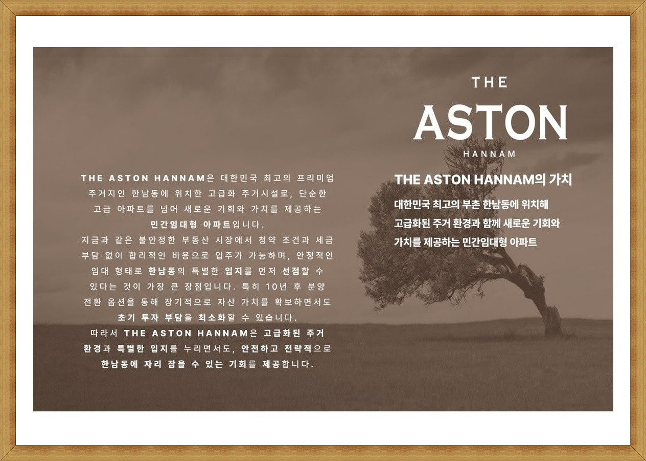 한강과 남산을 누리는 최고의 명장 자리이자 국내 부촌의 명성을 갖춘 한남동 한남역 역세권, 한남동의 중심에 민간임대 아파트 디 애스턴 한남이 입주자모집을 진행하고 있습니다.