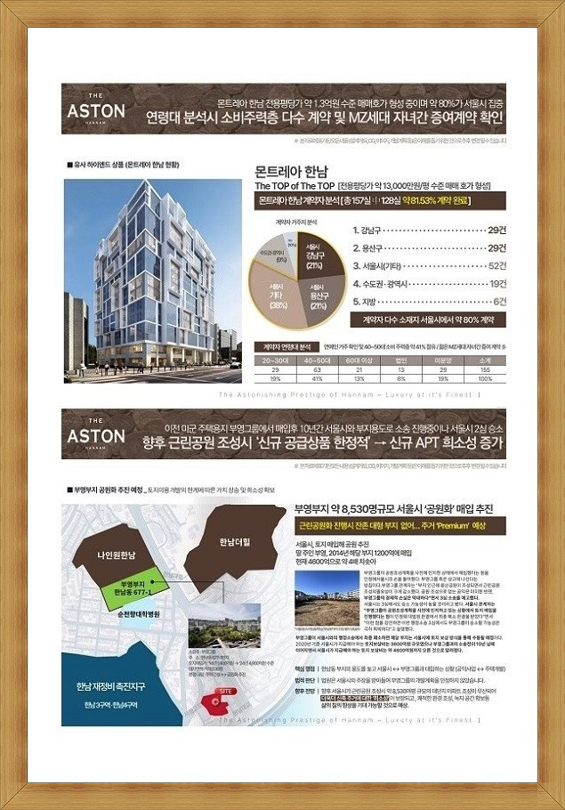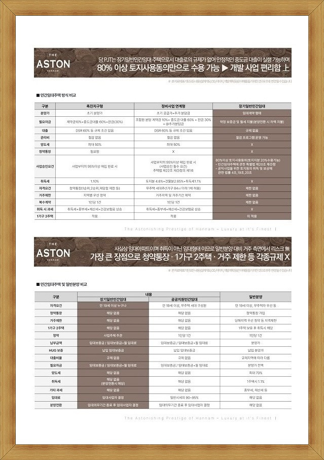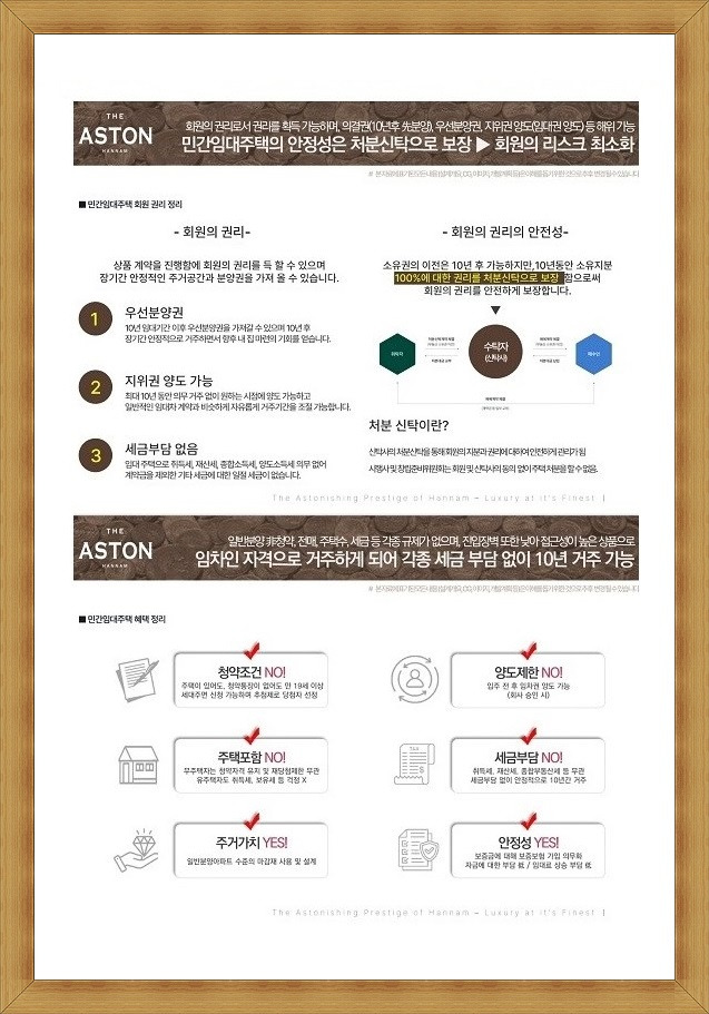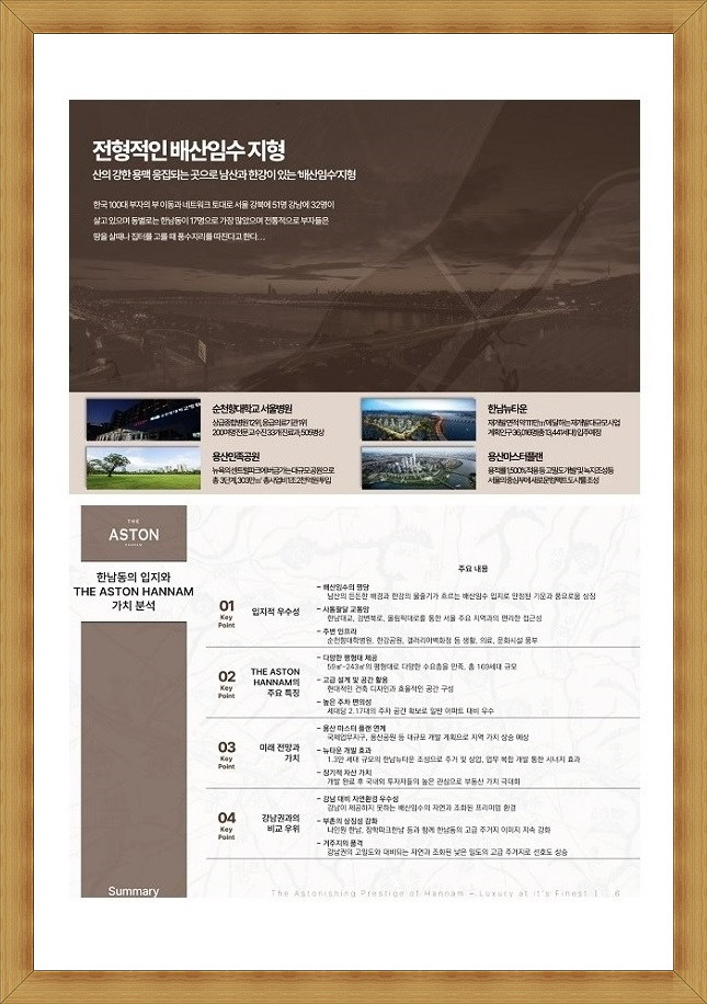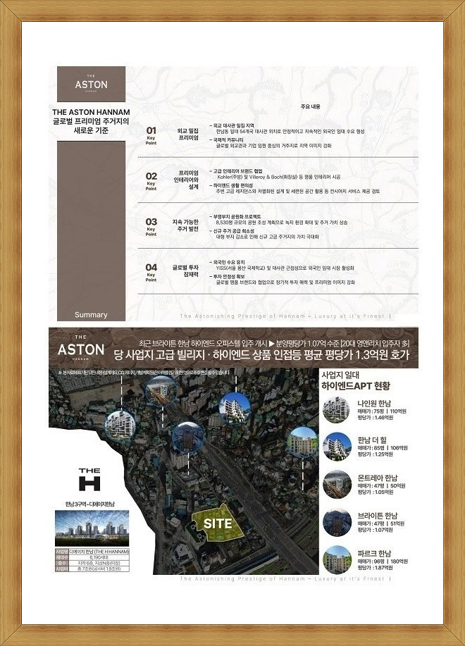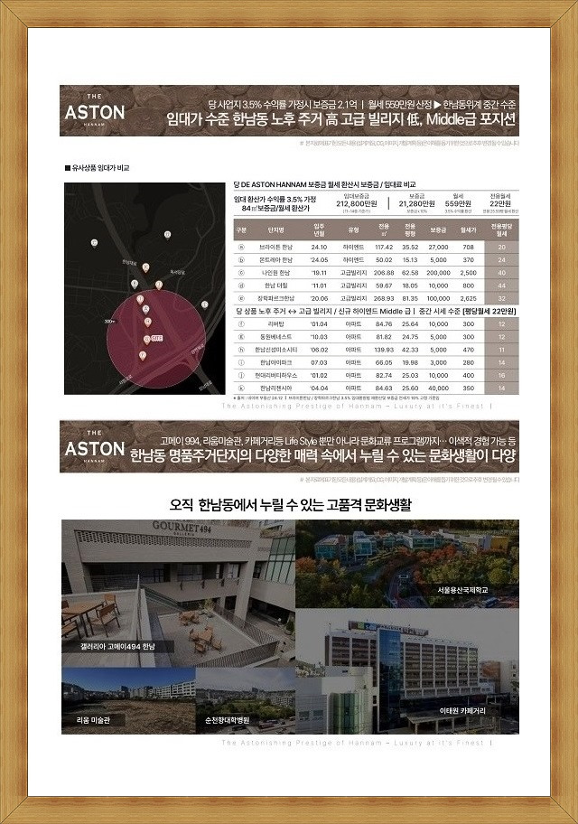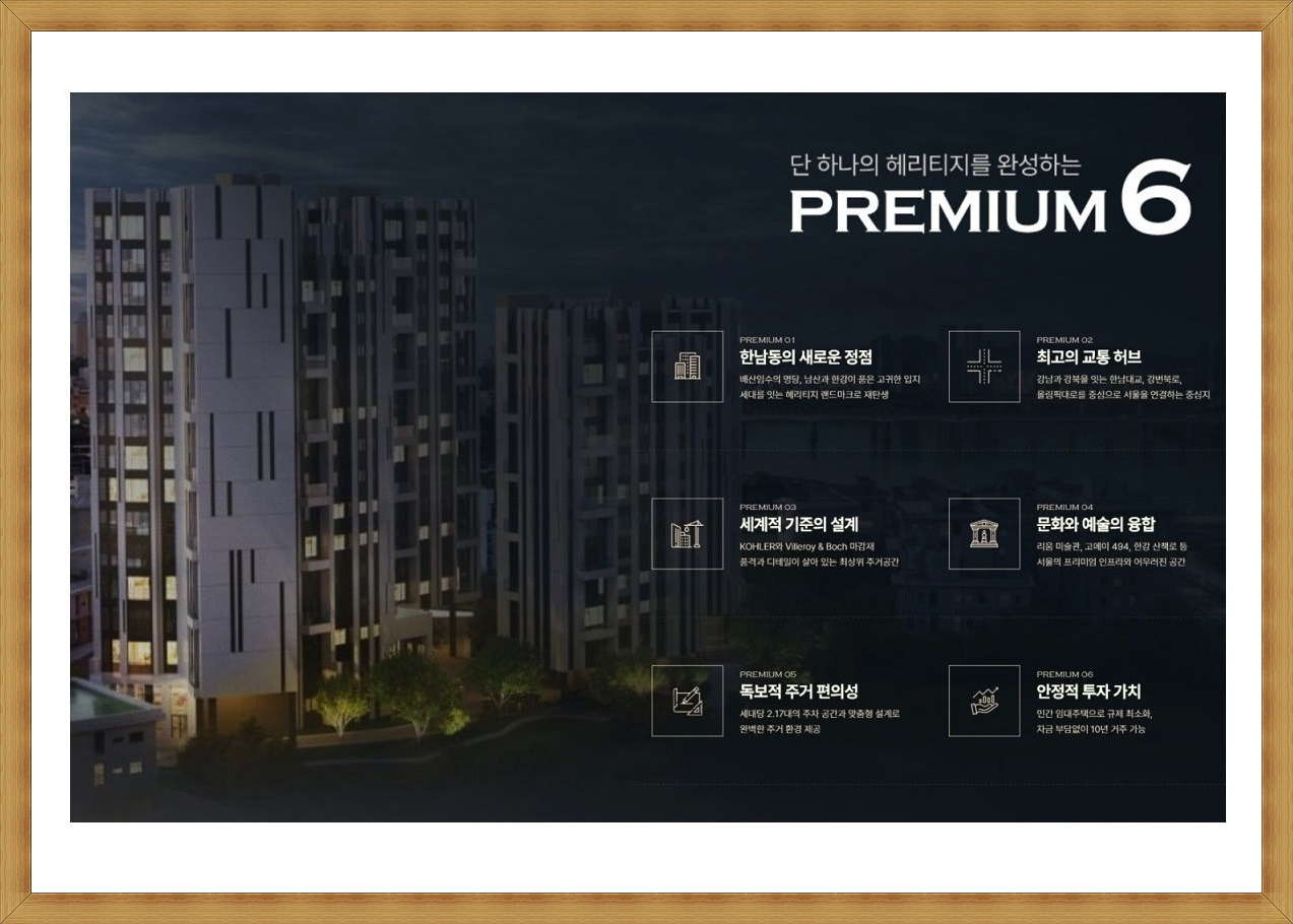 고급부촌 주거지 프리미엄 한남동의 새로운 정점, 자연과 조화된 낮은 밀도의 고급 거주지 배산임수의 명당, 최고의 교통 허브, 세계적 기준의 설계, 문화와 예술의 융합, 독보적 주거 편의성, 안정적 투자가치, 용산 마스터플랜(국제업무지구∘용산 민족공원 등 대규모 개발계획으로 지역가치상승 예상)과 뉴타운 개발효과(1.3만 세대 규모의 한남뉴타운 조성으로 주거 및 상업∘업무복합개발 통한 시너지효과) 새로운 시대의 중심이 될 미래가치 실현, 개발완료 후 국내외 투자자들의 높은 관심으로 장기적 자산가치 극대화, 민간 임대주택으로 규제 최소화, 자금 부담 없이 10년 거주가 가능합니다.