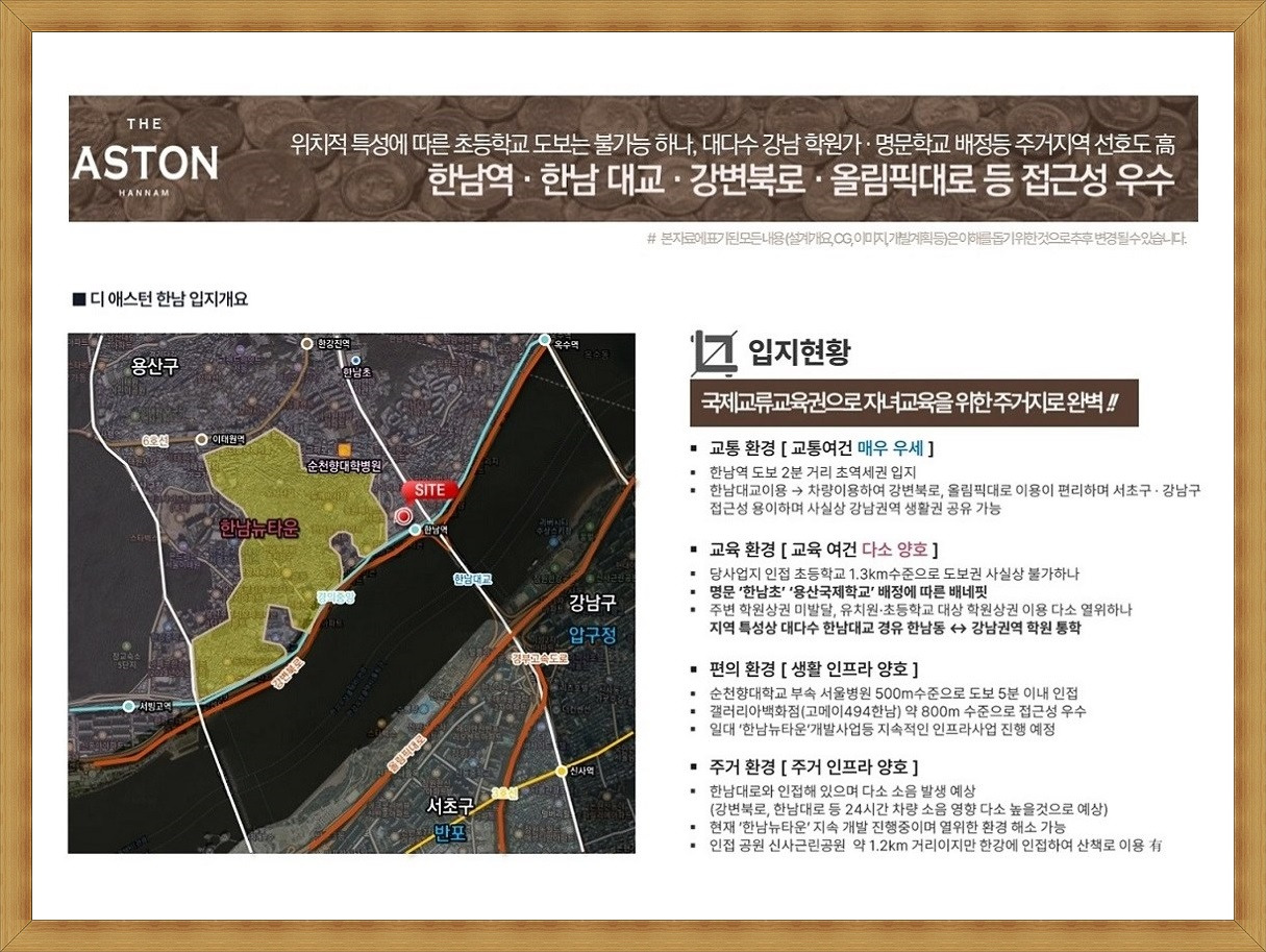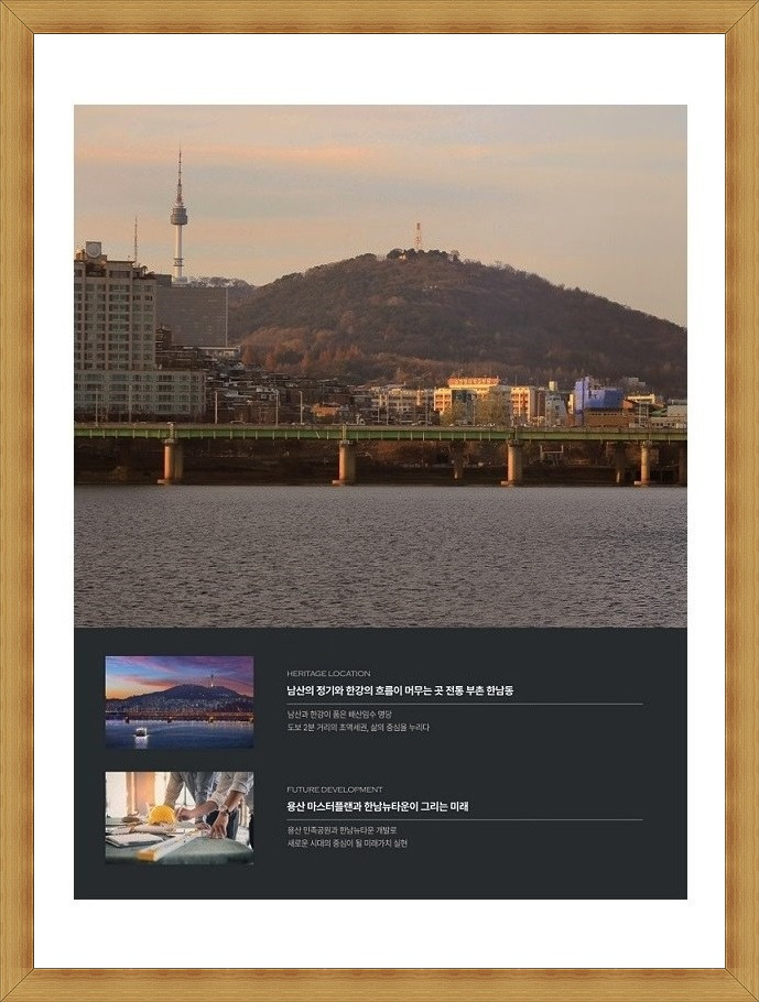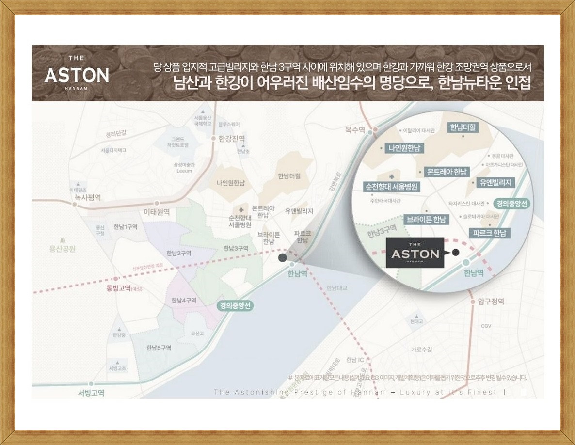 산의 강한 용맥 응집되는 곳으로 남산의 정기와 한강의 흐름이 머무는 곳, 남산과 한강이 품은 배산임수 명당, 전통 부촌 한남동, 한남3구역과 맞닿은 노른자 땅에 입지합니다.