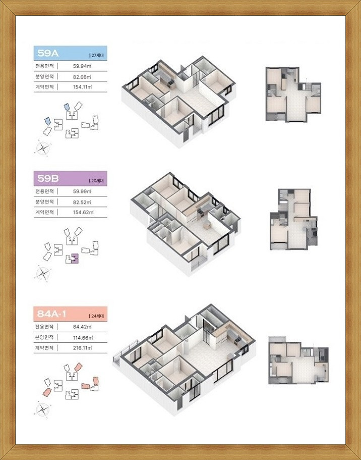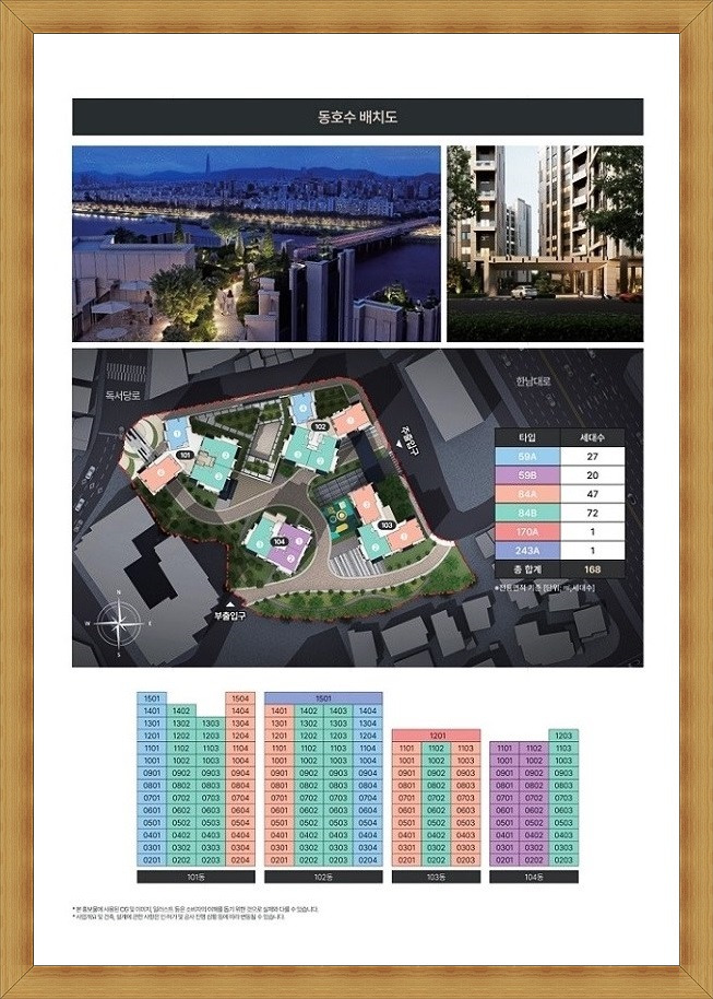 주요 대로 인접 및 특정 동∘호수 한강조망 확보, 현대적인 건축 디자인, 넓은 동간 거리 확보로 일조량과 프라이버시 보호, 획일적인 평면설계에서 벗어나 가족 단위 실거주자들의 라이프 스타일에 맞춰 다양한 니즈를 충족시킬 수 있는 전용면적 ▲59㎡A∘B ▲84㎡A-1∘A-2∘B-1∘B-2 ▲171㎡A ▲243㎡A Type 3Bay 판상형 맞통풍∘프라이버시를 위한 탑상형 더 넓고 더 높은 혁신 평면구조로 구성하였습니다.