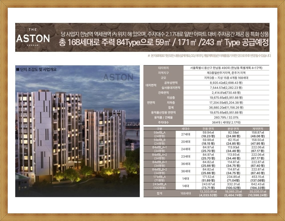 디 애스턴 한남 사업명으로 서울특별시 용산구 한남동 490외(한남동 특별계획 4-1구역) 제3종일반주거지역, 준주거지역에 지하3층~지상최고15층 4개 동(➡3개 동으로 설계변경 예정) 규모로 조성(예정)되며 공동주택(아파트) 168세대로 구성(예정) 됩니다.