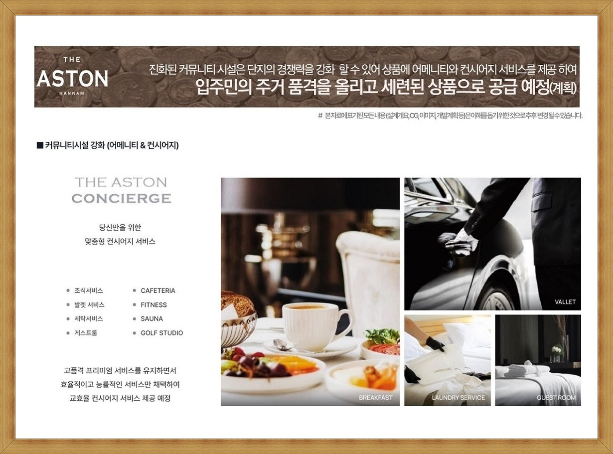 피트니스, 실내 골프장, 사우나, 카페테리아 등 최고의 퍼포먼스를 제공하여 매일 최상의 컨디션을 유지할 수 있는 다양한 어메니티 적용 및 조식서비스, 발렛서비스, 세탁서비스, 게스트룸 등 고품격 프리미엄 서비스를 유지하면서 품격 있는 생활을 지원하는 효율적이고 능률적인 서비스만 채택한 고효율 맞춤형 컨시어지 서비스를 계획하고 있습니다.