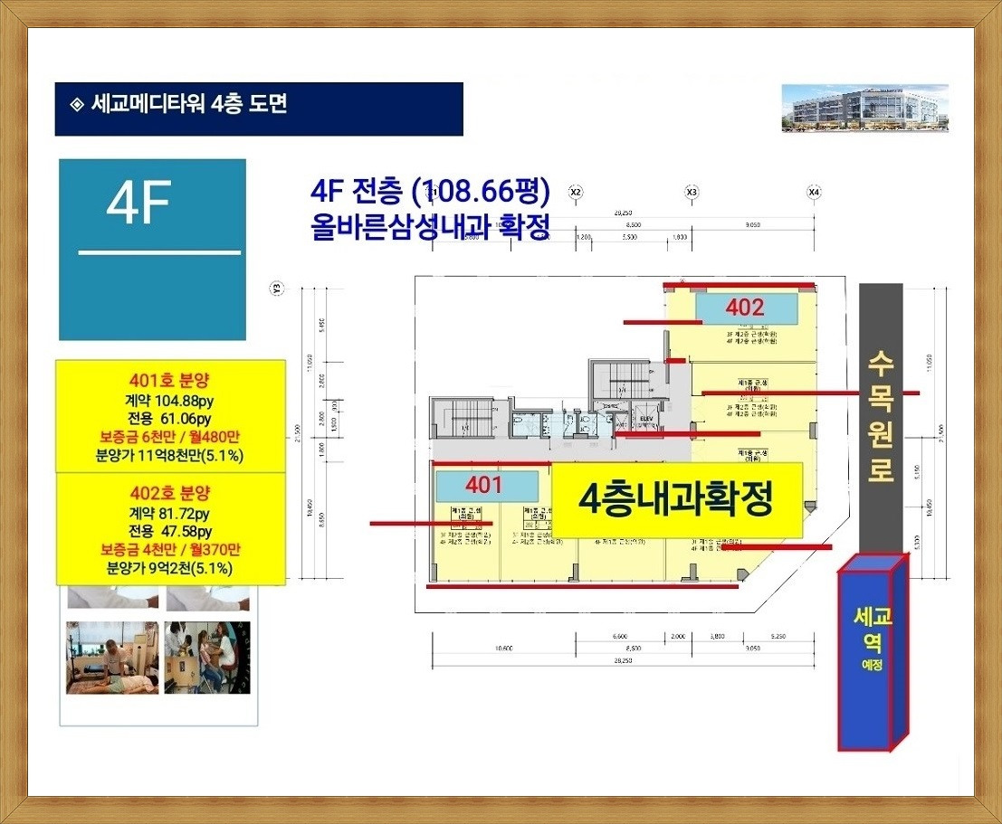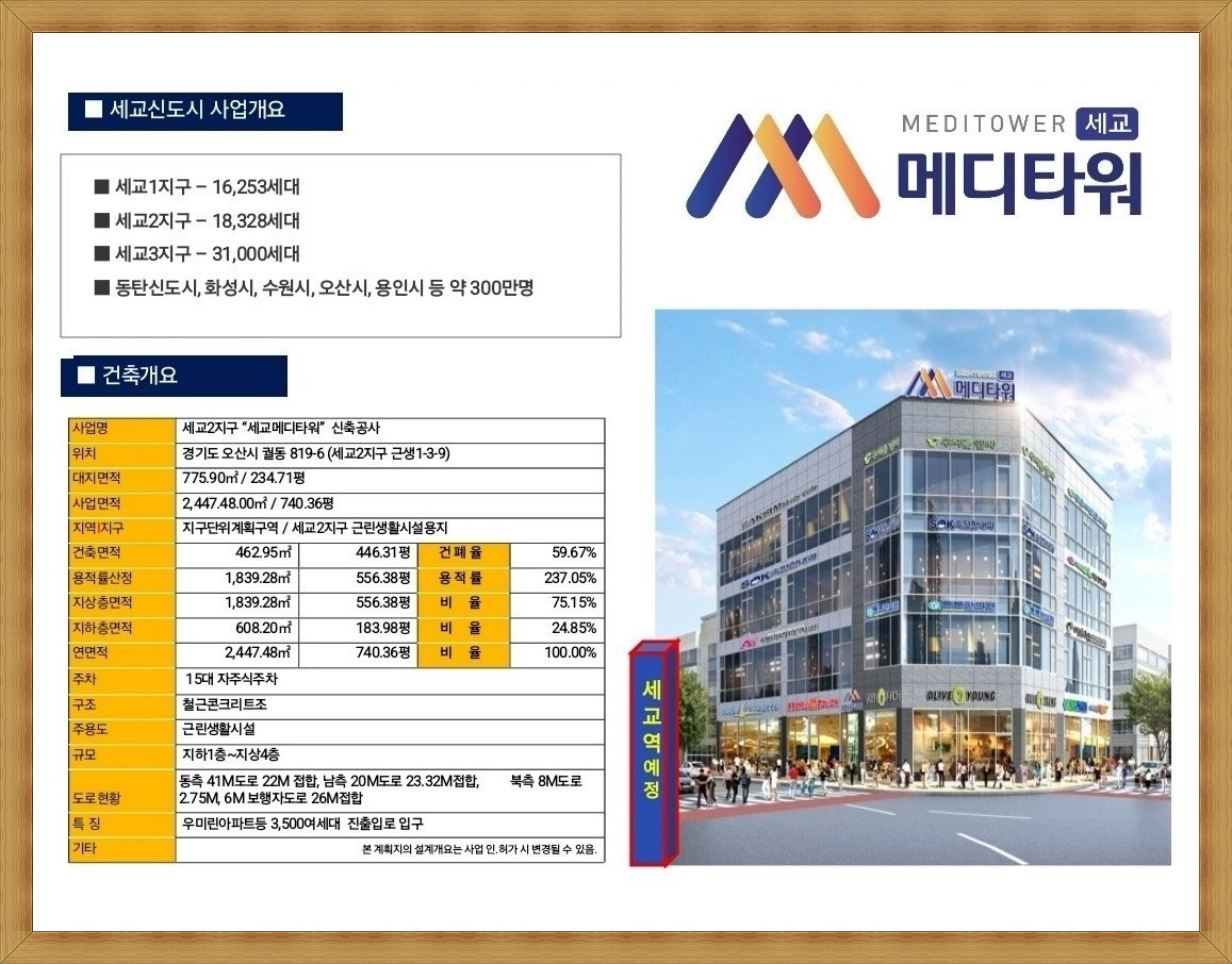세교2지구 세교 메디타워 신축공사 사업명으로 경기도 오산시 궐동 819-6(세교2지구 근생1-3-9) 지구단위계획구역, 세교2지구 근린생활시설용지에 지하1층~지상4층 규모로 조성(예정)되며 근린생활시설로 구성(예정) 되었습니다.