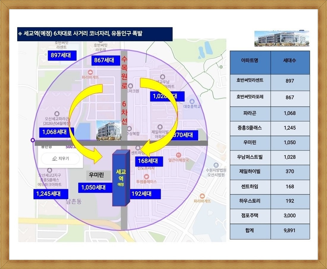 경기 남부를 대표하는 생활권역의 한 축으로 확장하고 있으며 수도권 반도체 클러스터의 중심인 오산 세교2지구 우미린아파트 등 3,500여 세대 진출입로 입구 유동인구 폭발 6차대로 사거리 코너에 입지합니다.