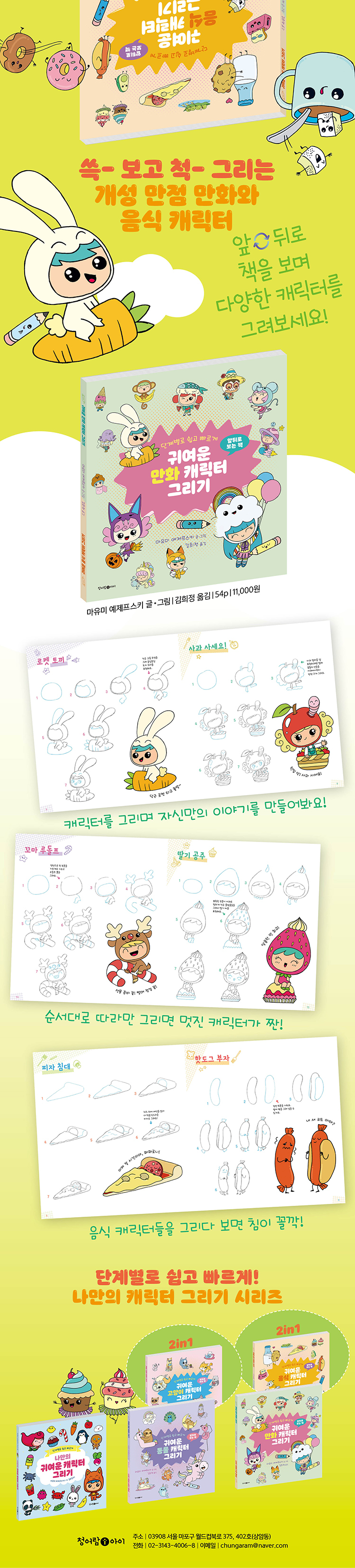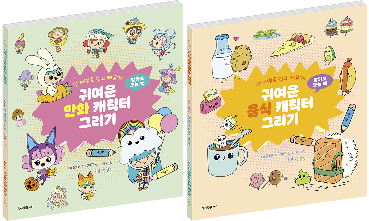 『나만의 귀여운 캐릭터 그리기』는 우리 주변의 음식이나 물건, 좋아하는 동물을 나만의 스타일을 살려 동글동글 귀엽고 단순한 캐릭터로 표현하는 방법을 소개해요. 『귀여운 동물 캐릭터 그리기 / 귀여운 고양이 캐릭터 그리기』는 앞뒤로 보는 형식의 책으로, 신비한 별별 동물들과 사랑스러운 고양이 캐릭터를 쉽고 간단하게 그리는 방법을 알려줍니다.