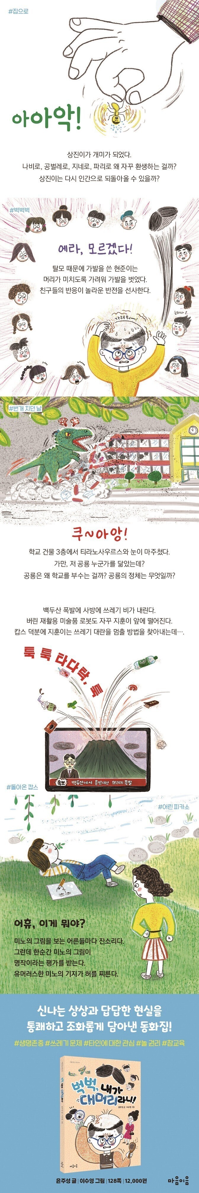 상상은 재미있다. 현실에서 하지 못하는 것을 상상으로는 다 할 수 있으니까. 이 상상은 잠재되어 있거나, 파편처럼 떠도는 나의 심리, 성향, 환경 등 각자가 지닌 사실들에서 출발하고, 이 낱낱의 사실들을 발견해 상상과 잘 버무리면 창의력이 된다고 한다. 색다른 동화『벅벅, 내가 대머리라니!』는 이런 사실(현실)과 상상의 문턱을 가뿐하게 뛰어넘어 어린 독자들의 그저 그런 일상을 한바탕 신나는 놀이판으로 만들어 준다. 뿐만 아니라 일상생활에서 뭔가 답답하고, 아리송했던 것들을 포착해 풍선처럼 부풀리고 부풀린 후 빵, 터뜨려 마음에 얹힌 스트레스를 시원하게 날려 주기도 한다.