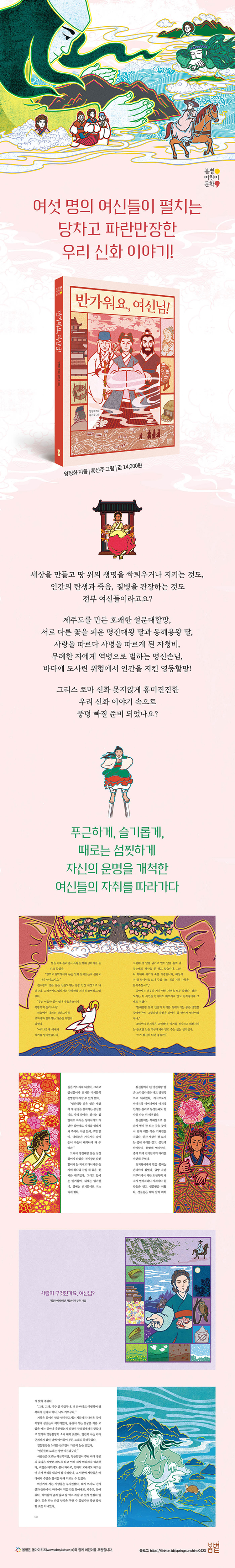 그리스 로마 신화와 북유럽 신화는 어른 아이 할 것 없이 사랑받고 있어요. 제우스와 헤라를 비롯한 여러 신이 펼치는 흥미진진한 일화나, 오딘과 토르, 록키가 아스가르드에서 벌이는 다툼에 눈을 떼지 못하지요. 그런데 왜 우리 신화는 잘 모를까요? 제주에 있는 신만 18,000명이나 된다고 하니, 우리 곁에는 얼마나 많은 신이 있을까요? 이렇게 많은 신이 우리 주변 곳곳, 각자의 자리에서 세상을 지키며 유럽 신화에 못지않은 다양한 이야기를 남겼다는 사실 하나는 확실해요. 그 이야기들이 얼마나 흥미진진한지 온 사람을 붙들고 말해 주고 싶을 정도예요.