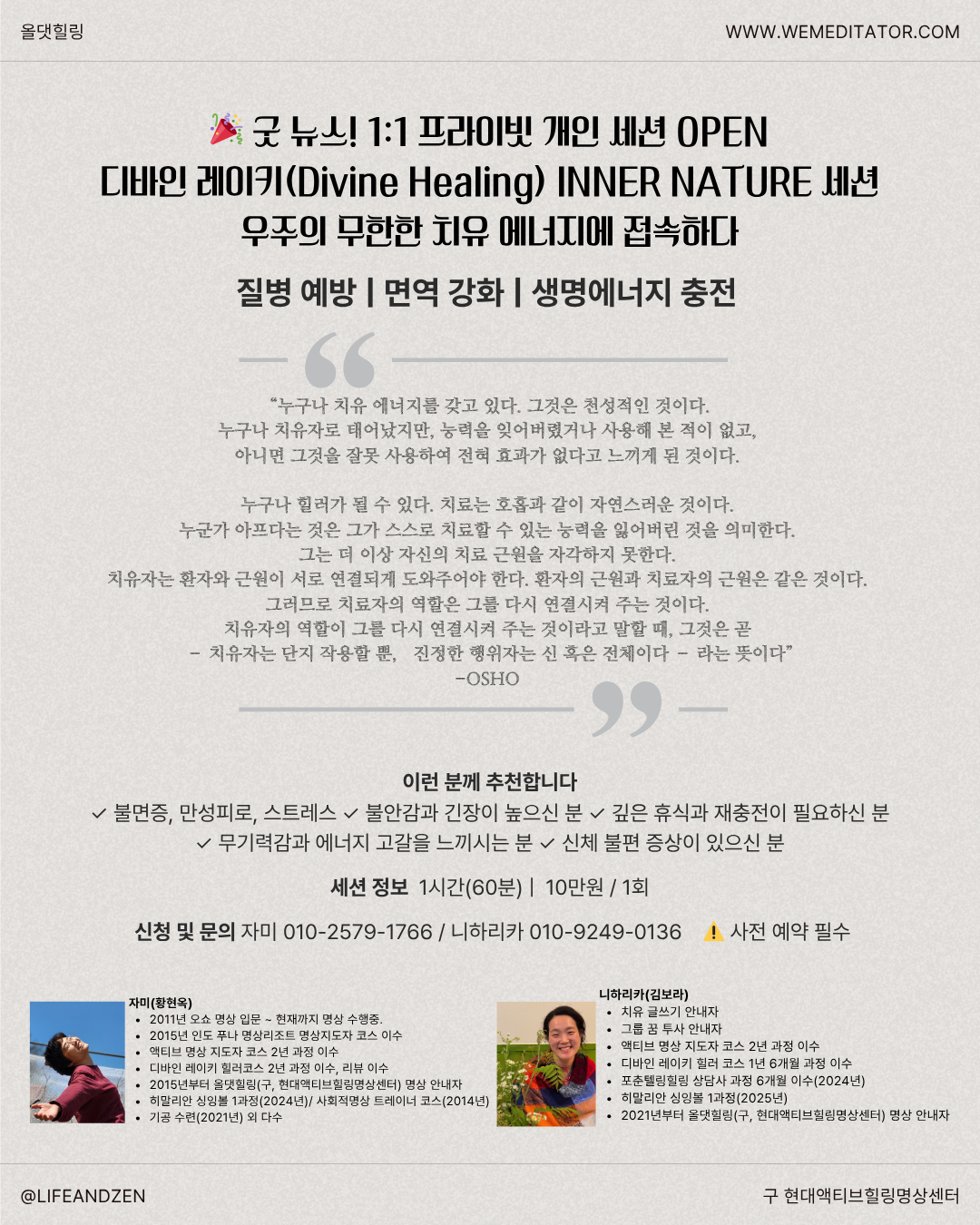 - 오후 3시~4시: 스페셜 분노치유, 슬픔치유 명상 중 택 1
