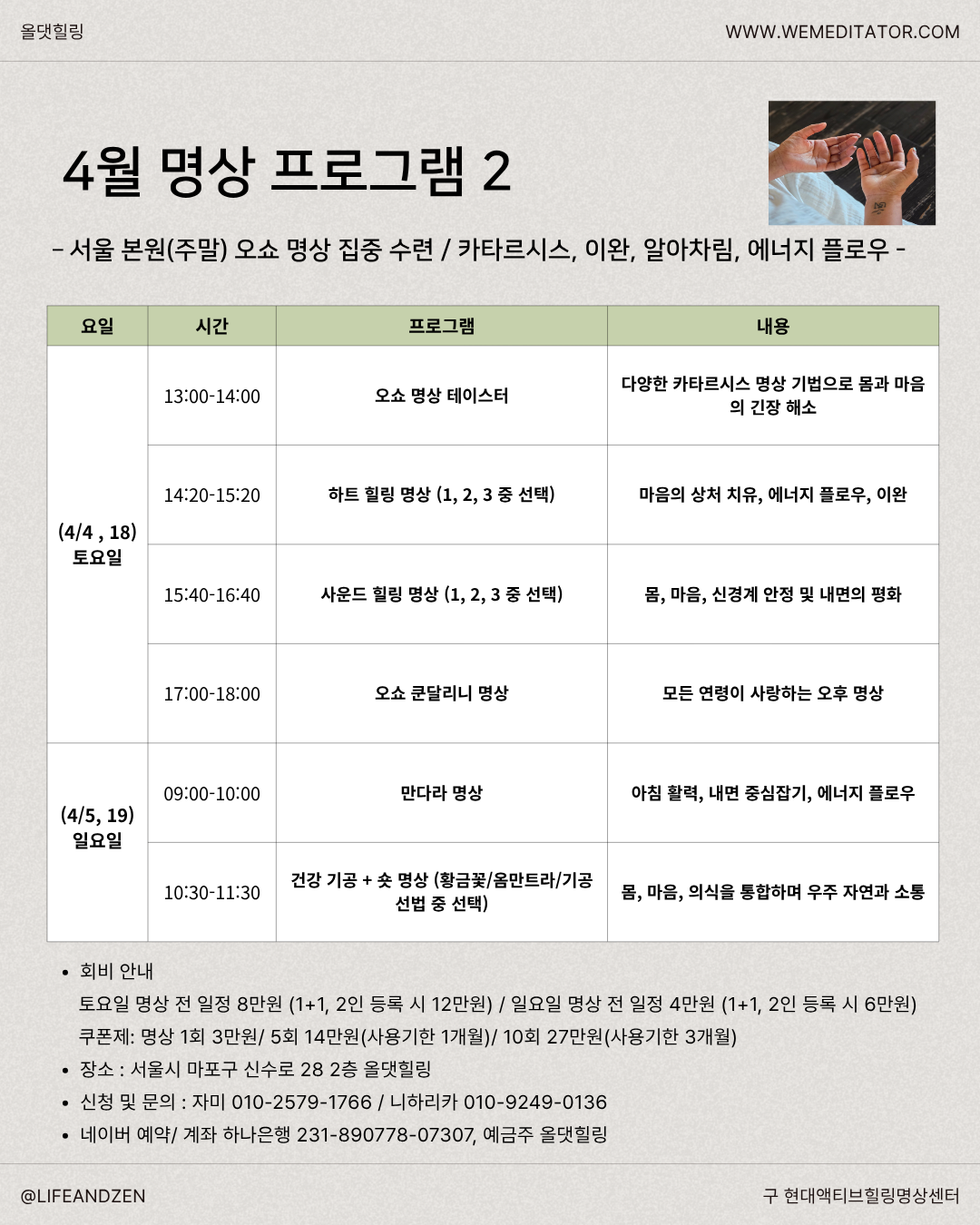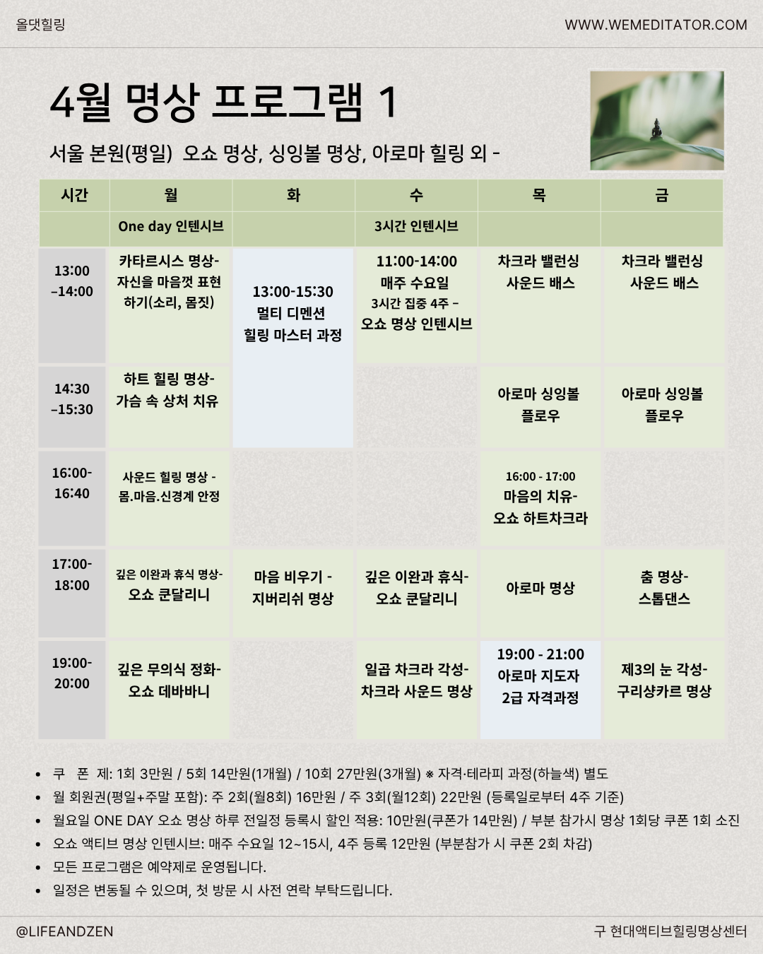 혹시 요즘 일상 속에서 지쳐있지 않으신가요? 명상과 마음챙김으로 몸과 마음을 깊이 있게 다시 채울 수 있는 특별한 공간이 있습니다. 올댓힐링의 4월 명상 프로그램이 여러분의 마음을 기다리고 있습니다.