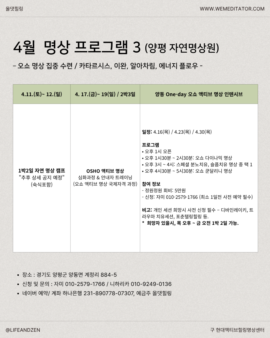 - 4월 16일, 4월 23일, 4월 30일, 목요일: 양평 One-day 오쇼 액티브 명상 인텐시브: