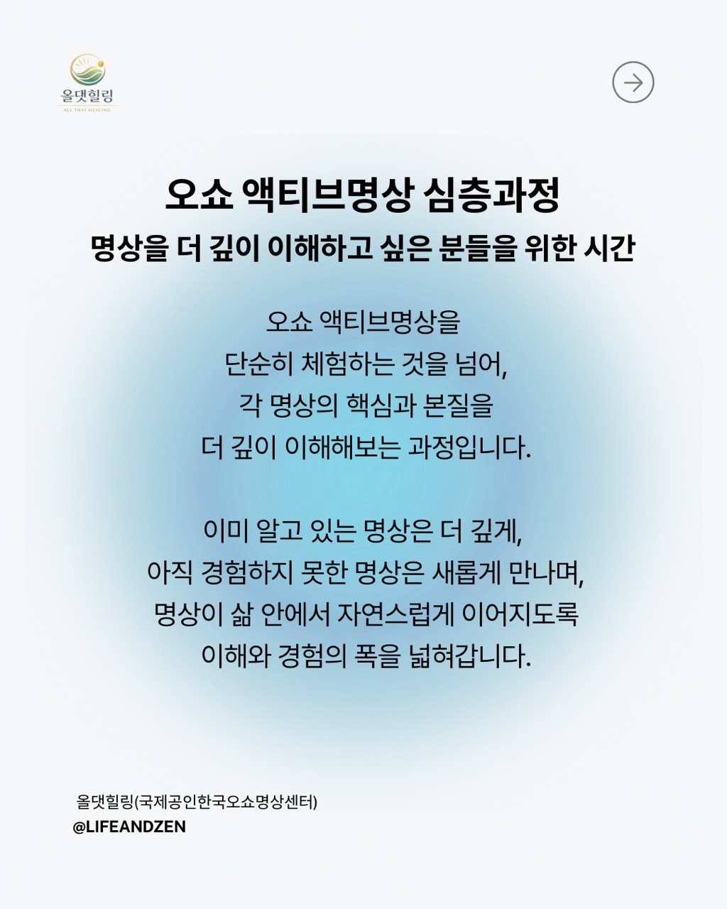 • 오쇼 차크라 명상, 오쇼 하트 명상 등 액티브 명상