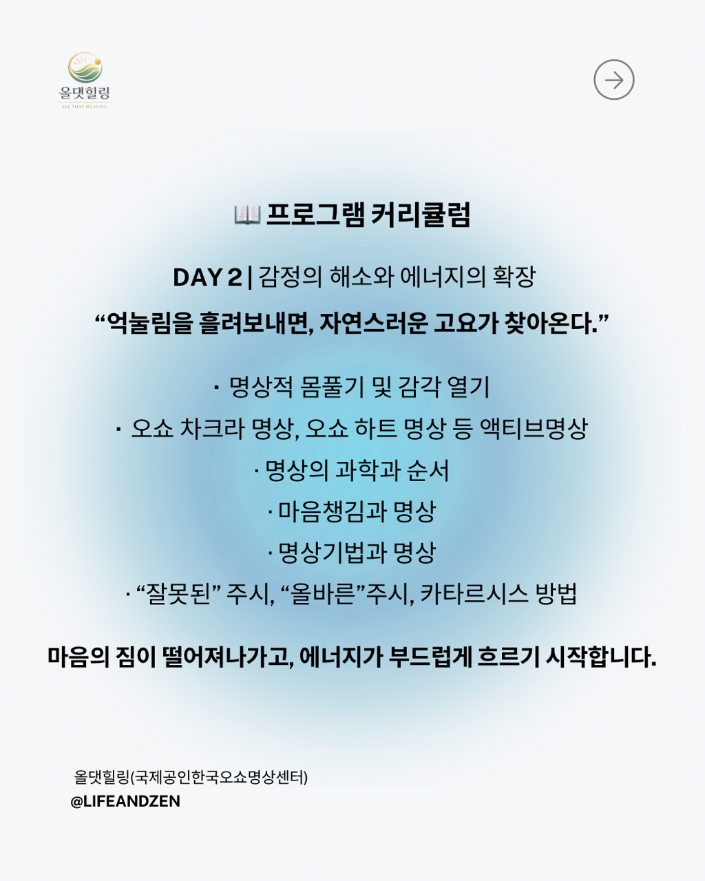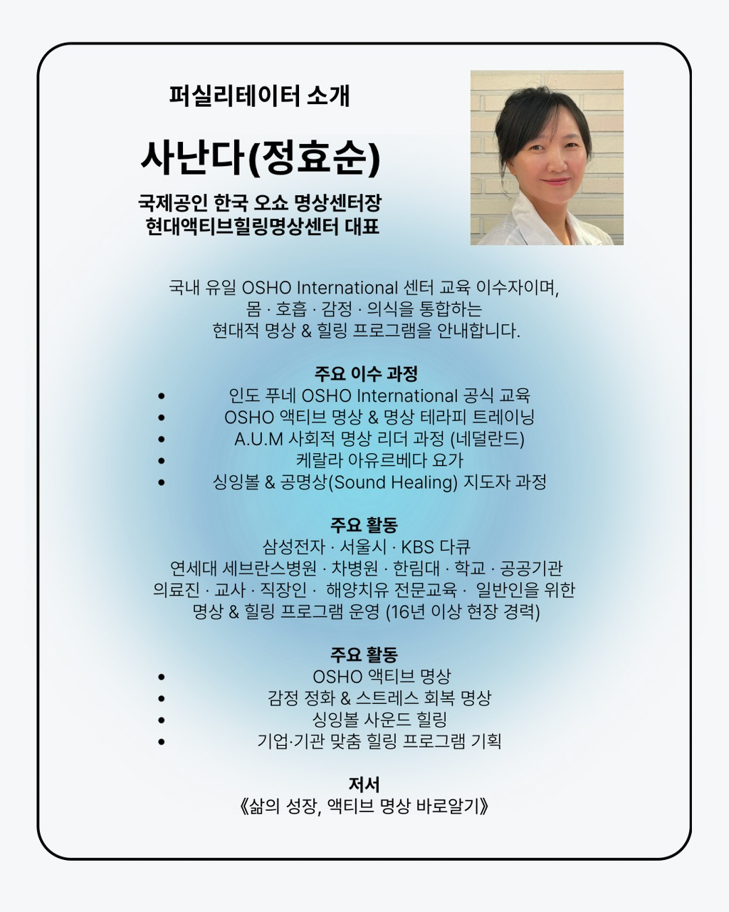 몸, 호흡, 감정, 의식을 통합하는 현대적 명상 and 힐링 프로그램을 안내합니다.
