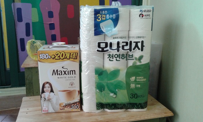 이건, 우렁각시 아딜라~, 밤늦게 남편과 함께 살금살금 센터에 갖다준 머그컵(다량)과 수건~ ㅎㅎ