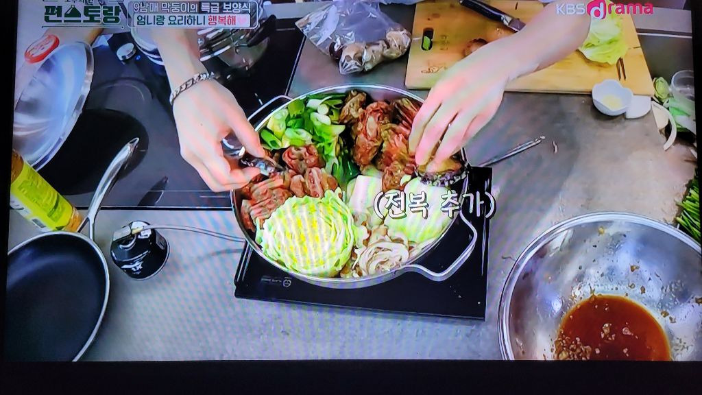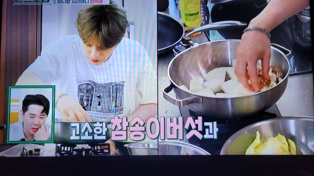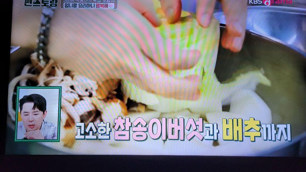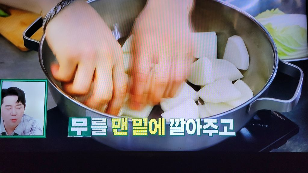 ㅡ 냄비에 무를 깔고 참송이버섯, 알배추, 밑간한