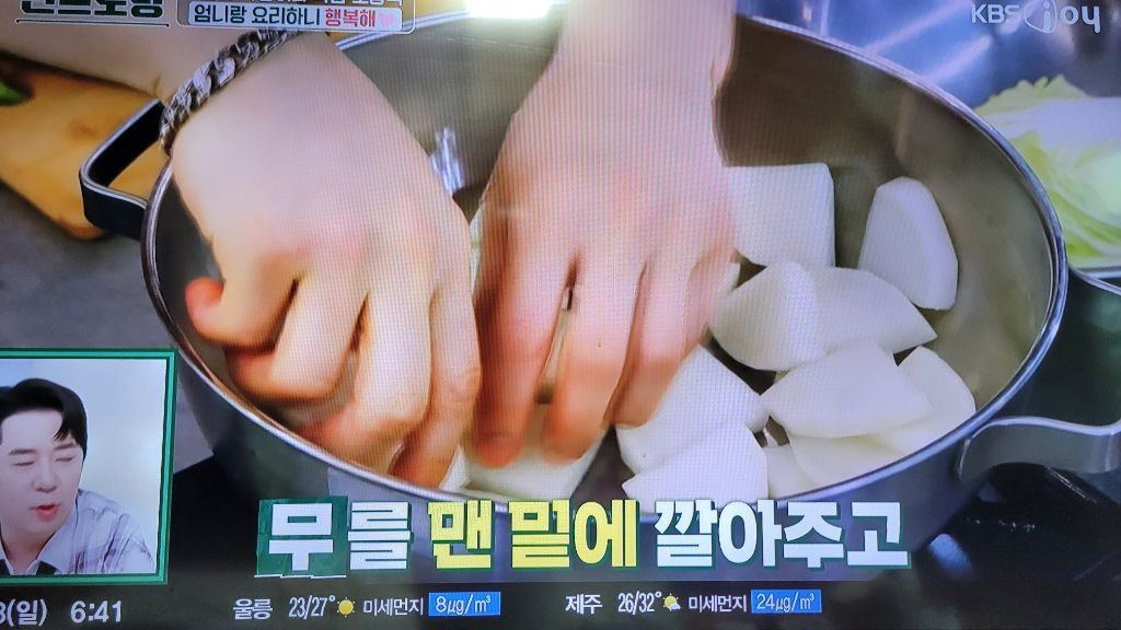 무는 바닥에 깔도록 나박썰기, 대파는 어섯썰기