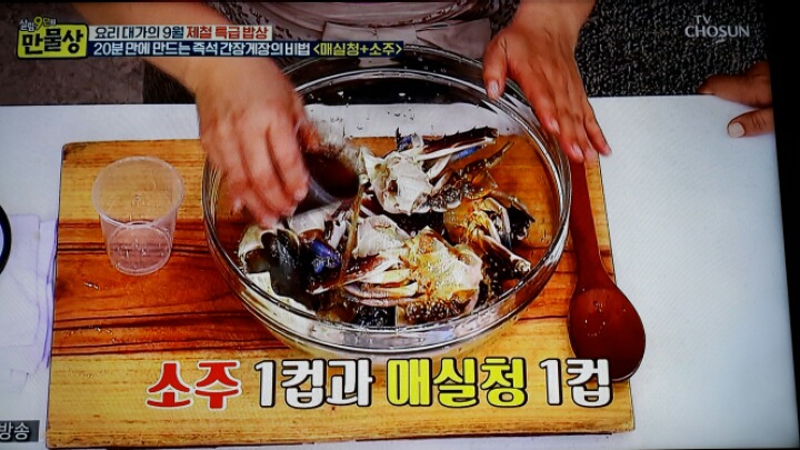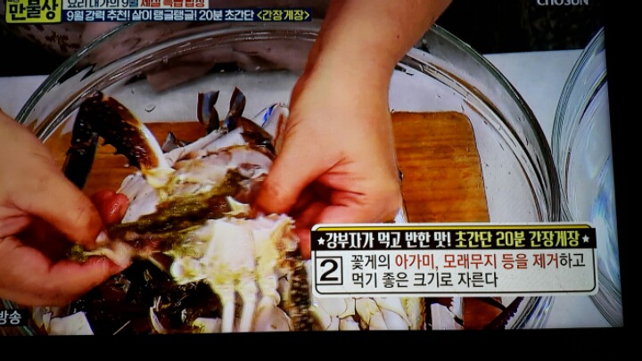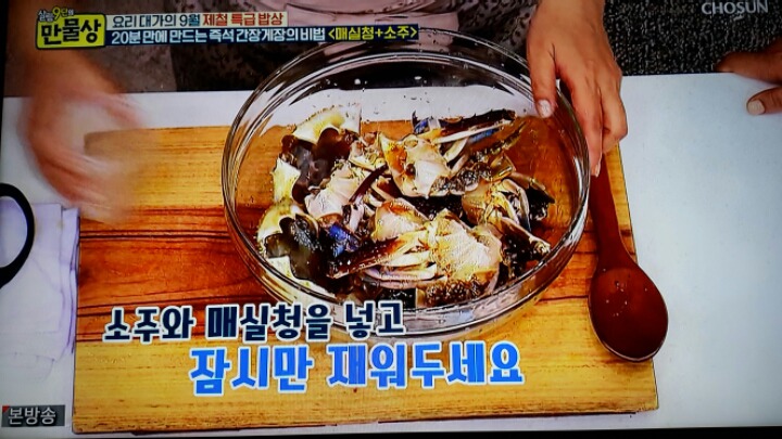 10분후 꺼낸 꽃게는 등딱지를 제거하고 잘라 먹기좋게 손질한 다음 소주와 매실청에 재워둔다.