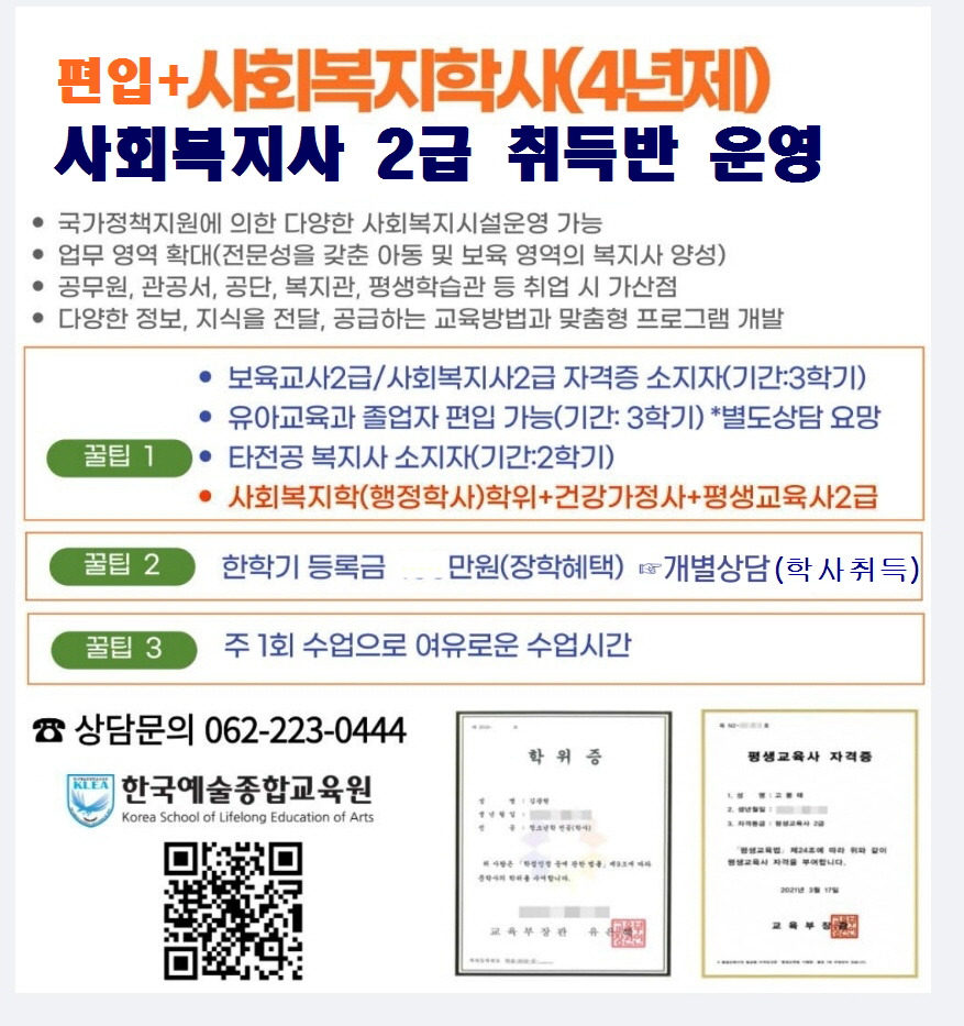 본 과정은 타전공 대상으로 국가 자격증 및 학위 취득(대학원 진학)이 가능합니다. 개인 자격에 따라 학위와 동시에 건강가정사&평생교육사 2급&사회복지사 2급 취득 가능