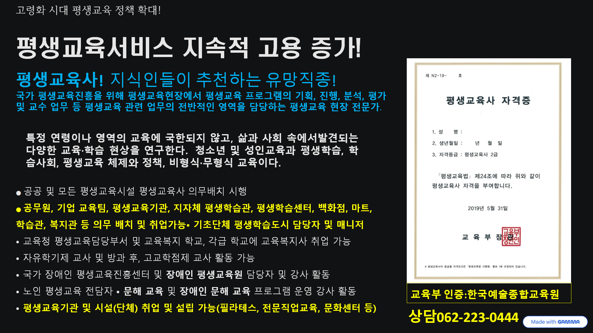 한국예술종합교육원은 교육부 정식 평가인정을 받은 과정을 운영하며, 국가 자격증 + 4년제 학위(대학원 진학) 취득 가능합니다.