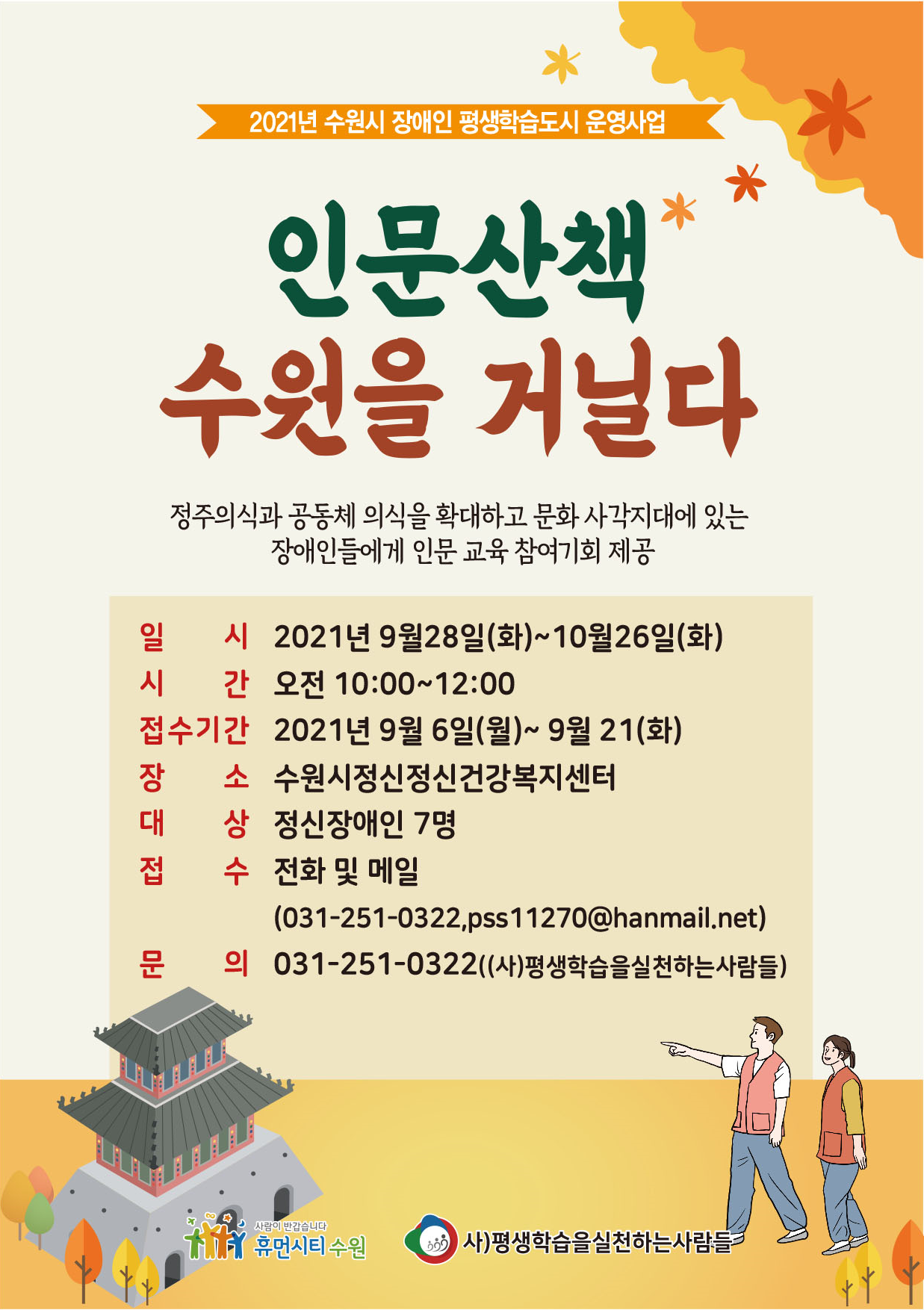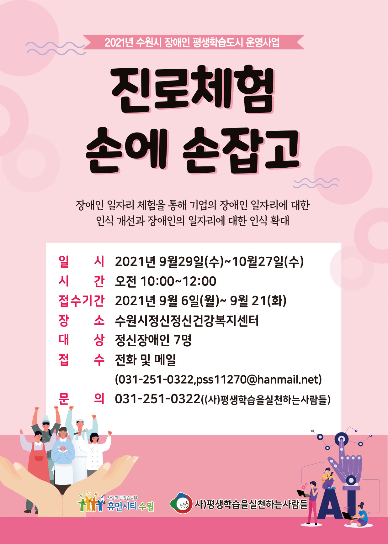 2021 수원시 장애인 평생학습도시 운영사업「인문산책 수원을 거닐다」, 「손에 손잡고 진로체험」, 수강생 모집 작성자사)평실사|작성시간21.09.06|조회수56 목록 댓글 0 글자크기 작게가 글자크기 크게가 다음검색 현재 게시글 추가 기능 열기 북마크 공유하기 신고 센터로 신고 댓글 댓글 0 댓글쓰기 답글쓰기 댓글 리스트