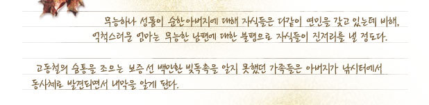 - 무능한 남편이 위암 수술을 하고 건강이 여의치 않으면서부터 방앗간을 거의 혼자 돌리면서 생계를