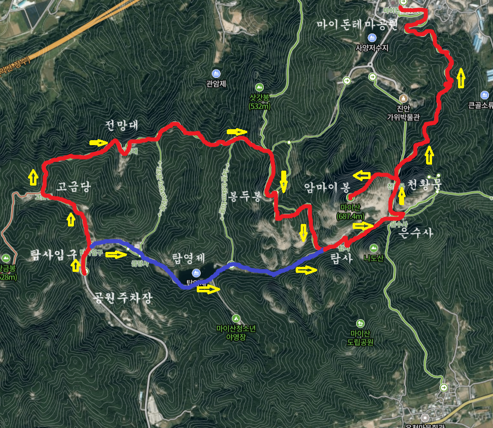 | 산행코스 | A코스: 남부주차장>탑사입구>고금당>전망대>봉두봉>탑사>은수사>천황문>마이산>천황문>마이돈테마공원 B코스:남부주차장>탑사입구>탑사>은수사>천황문>마이산>천황문>마이돈테마공원 |