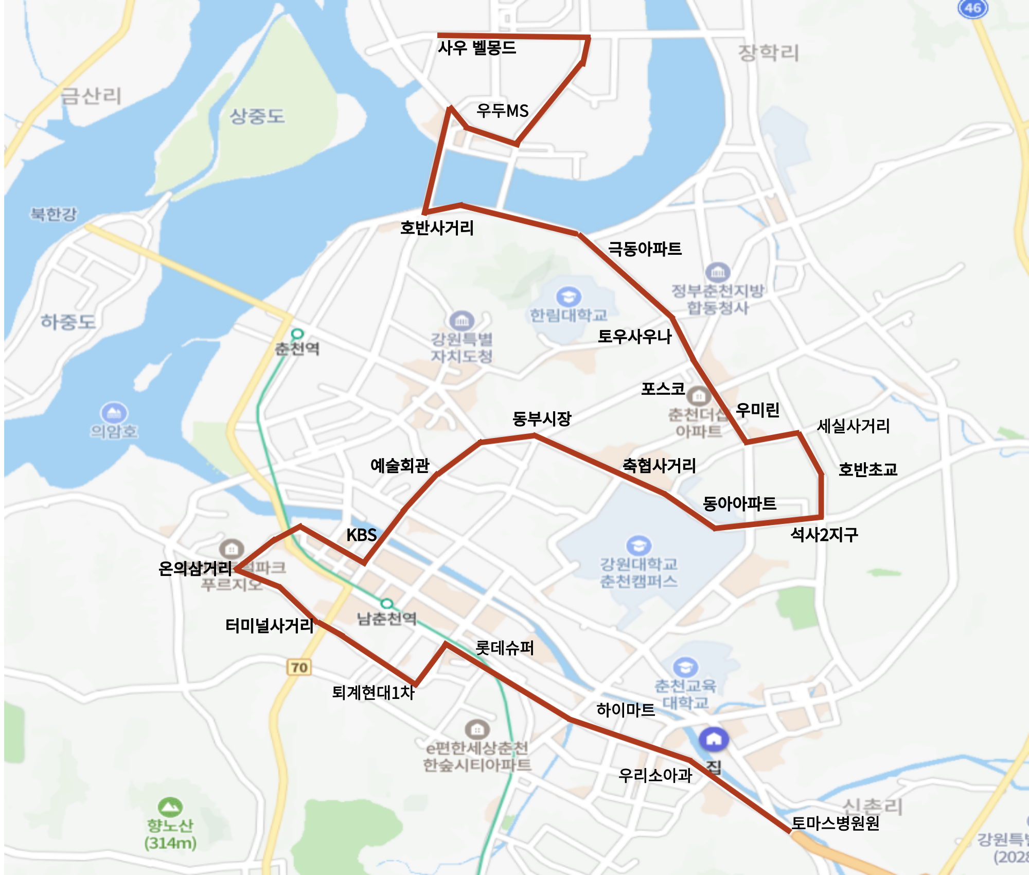 경유지 : 우두MS-호반사거리 - 후평극동아파트 -