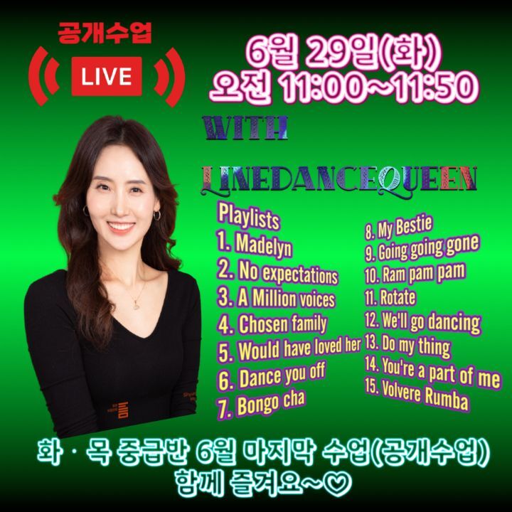 작성자라인댄스매니아 작성시간 21.08.04 어제 회원님들 수업하시는거 보고 깜놀했습니다^^ 15개 작품을 한시간에 다 하시다니 시작전에 긴장하셔서 벌써 생각이 안난다고 하시고 틀릴까봐 걱정하시는 윤정혜쌤의 말씀에 동감합니다 ~^^ 대한민국 최강의 회원들이시고 윤정혜쌤의 중간중간 리스타트 알려주시고 하는 모습에 또 배웠습니다 ~~~ 모두 넘 잘하셨어요^^