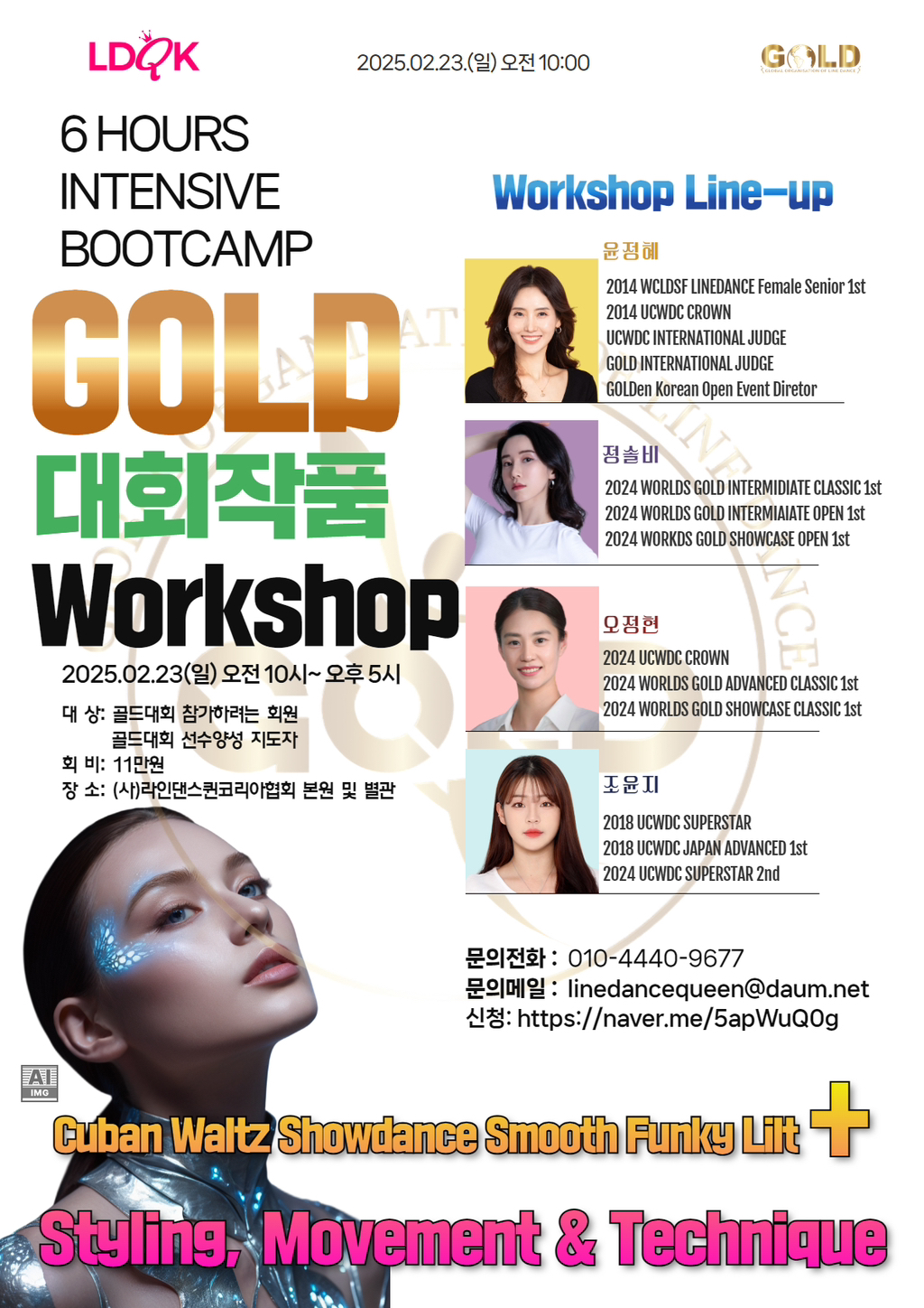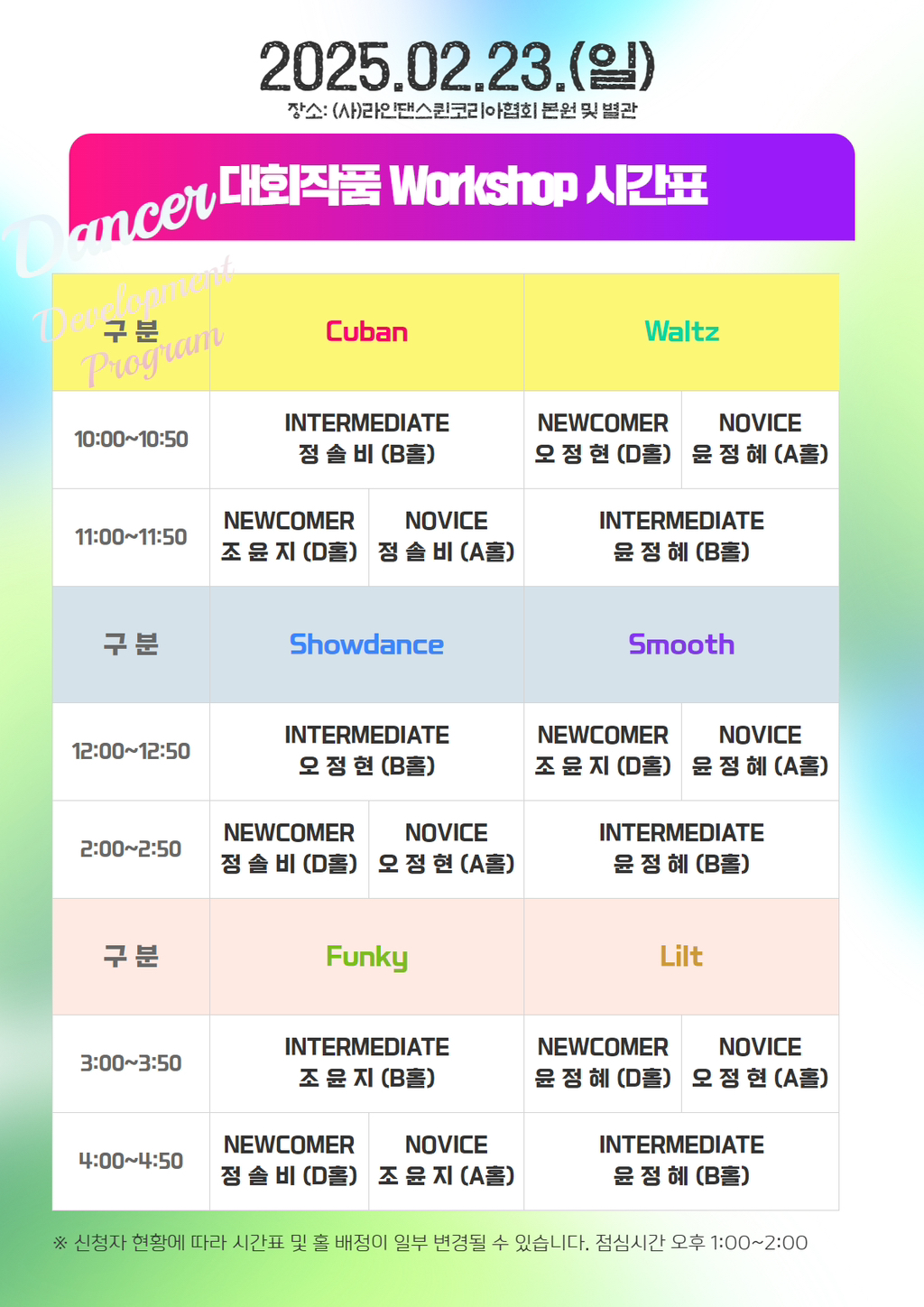 이번 워크숍에서는 Cuban Waltz Showdance Smooth Funky Lilt 장르의 작품을 통해 Styling, Movement, & 테크닉을 심도 있게 배우고 적용하는 시간을 마련했습니다. 대회 참가 및 수상경력이 있는 윤정혜, 오정현, 정솔비, 조윤지 강사님들의 지도 아래 다양한 스타일과 움직임을 익히고, 대회 준비에 필요한 실력을 한층 더 끌어올릴 기회를 제공합니다.