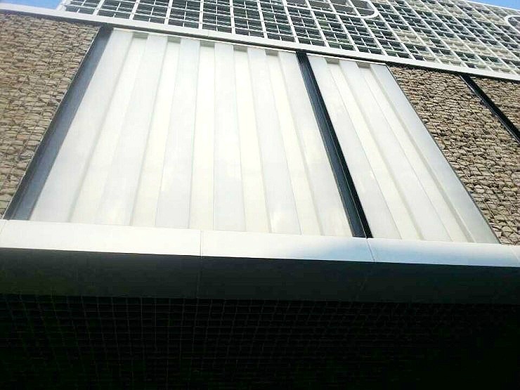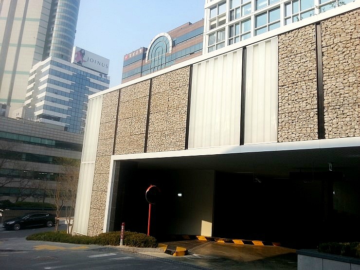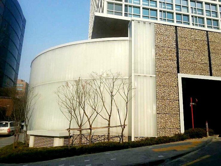 이러한 친환경 건축물 저층부 주차램프 구간에 포인트 형태로 Round구간과 직선구간에 최근 White한 Trend에 부합되도록 유글라스 저철분 프로스트(U-glass Low Iron Frost) 싱글 형태로 시공이 되었습니다.