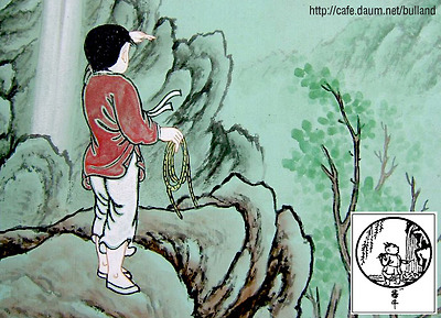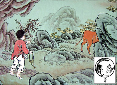 득우(得牛) 네번 째는 득우(得牛), 즉 '소를 얻다' 이니, 동자승이 드디어 소의 꼬리를 잡은 모습을 보여준다.