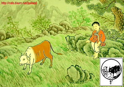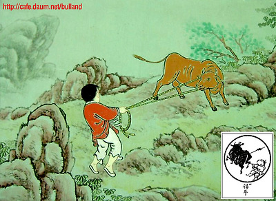 목우(牧牛) 다섯 번째는 동자승이 소에게 꼬뚜레를 꿰어 끌고 가고 있는 모습으로 이제 우리는 마음을 잡은 것이다. 하지만 아직도 오랜동안의 습관으로 제멋대로인 마음을 고행과 끊임없는 수행을 통해 길들여 나가야 한다는 뜻에서 소를 기른다는 의미로 목우라고 이름을 붙인 것이다. 그러지 않으면 언제 또 이 소가 어떤 진흙탕, 어떤 삼독(三毒)과 유혹 속에 빠질지 모른다. 길을 잘 들이면 소도 점잖아질 것이다. 그때에는 고삐를 풀어줘도 주인을 잘 따를 것이다.
