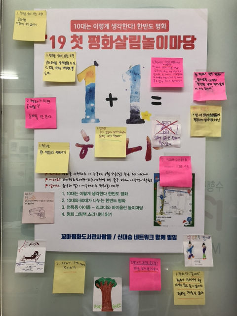 2019년 4월 7일 꼬마평화도서관사람들과 신대승네트워크가 어깨동무해 “10대는 이렇게 말한다! 한반도평화”란 이름으로 평화살림놀이마당을 열었다. 이 마당은 다섯 살배기부터 10대와 20대, 30대와 40대, 50대와 60대가 어울려 빚었다. 이 마당은 서른한 번째 꼬마평화도서관(이상언어논술학원)이 문을 여는 잔치와 더불어 열려 더욱 뜻깊었다.